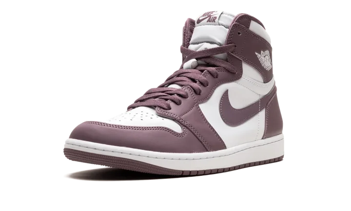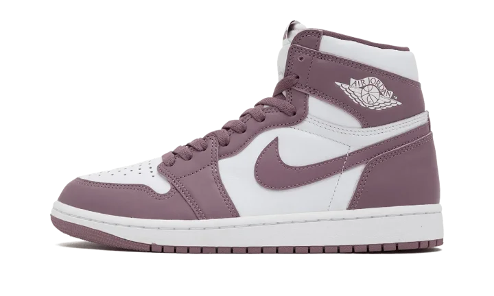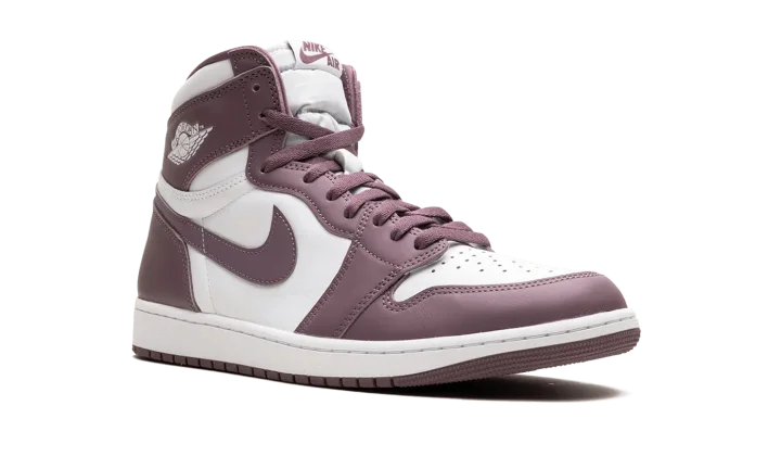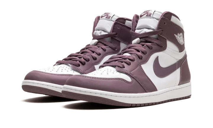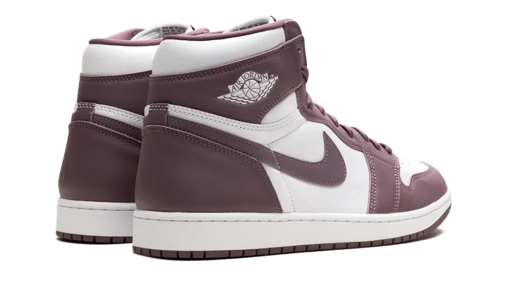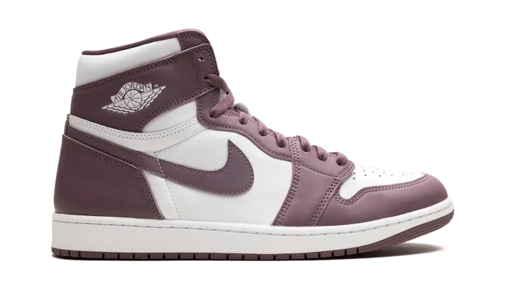 The Air Jordan 1 High OG "Mauve" is a colorway of the retro basketball shoe with an autumn-inspired design. From Jordan Brand's Fall 2023 collection, the Jordan 1 High OG "Mauve" features a white leather base that's contrasted with Mauve, or muted purple, leather overlay panels on the toe, forefoot, eyelets, collar, and heel. A Mauve leather Swoosh can be seen on each side of the shoe. "Wings" branding is found on the collar and "Nike Air" and Swoosh logos appear on the tongue tag. Underfoot, a white midsole and Mauve outsole complete the look. Release date: October 14, 2023