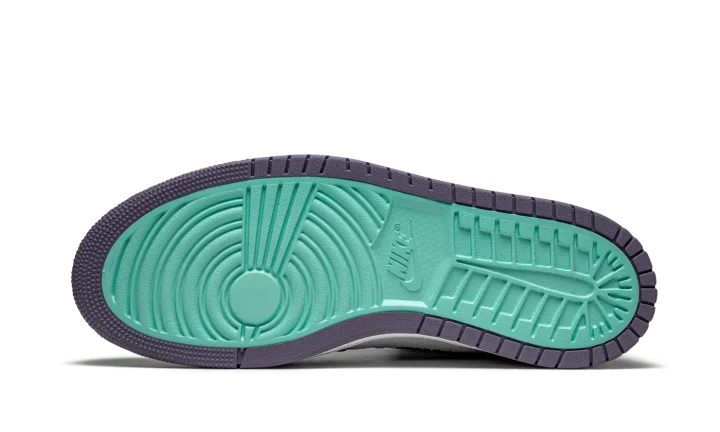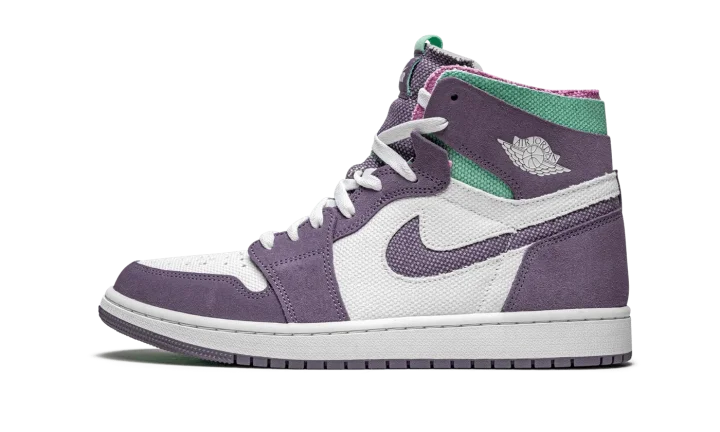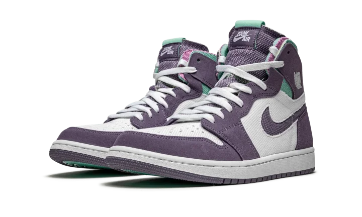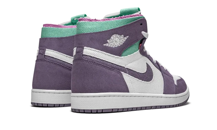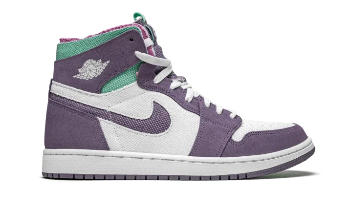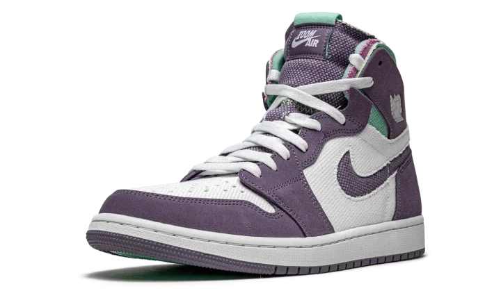 The Air Jordan 1 High Zoom CMFT "Tropical Twist" is a warm weather inspired look for the alternate, contemporary edition of Michael Jordan's first signature shoe. Introduced in 2020, the Jordan 1 Zoom CMFT (comfort) is an evolution of the retro basketball shoe that displays a deconstructed style influenced by Off-White's Air Jordan 1 collaboration from 2017. Additionally, the Zoom CMFT features even more padding around the collar. Here, the "Tropical Twist" displays purple suede detailing on the various panels that contrast the white canvas base. A purple Swoosh appears on both sides and a white "Wings" can be found on the collar. Teal-colored canvas graces the exposed foam collar. A "Zoom Air" tongue tag replaces the original "Nike Air" branded version that appears on the original Air Jordan 1. The midsole features Zoom Air cushioning, a deviation from the standard Air unit found in the original Air Jordan 1 High OG.