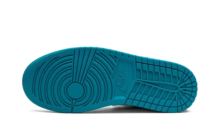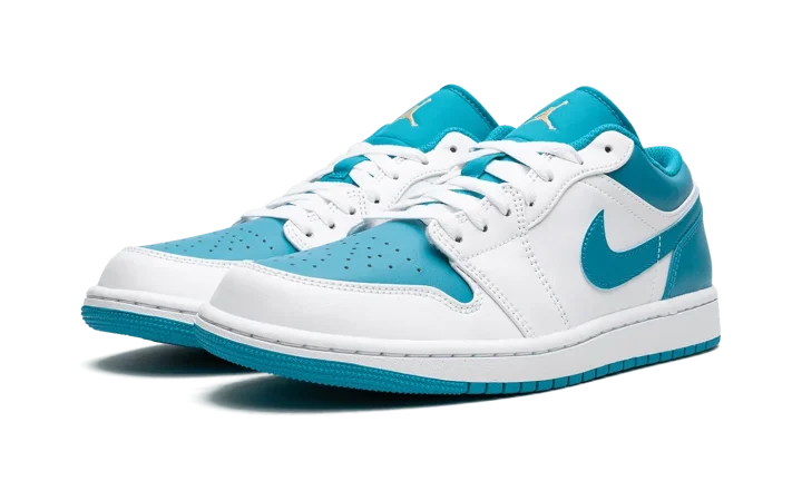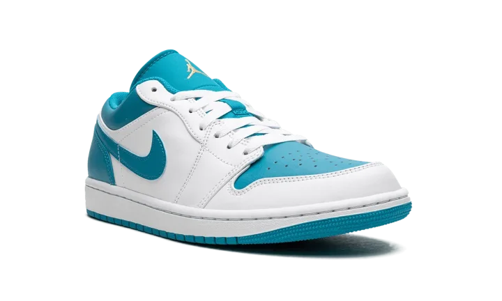 The Air Jordan 1 Low "Aquatone" is a colorway of the low-top lifestyle shoe with a warm-weather-inspired look. The "Aquatone" features aqua blue leather on its perforated toe, heel, Swoosh, and collar. The eye-catching shade of blue can also be found on the nylon tongue. White leather appears on the toe cap, forefoot, eyelets, and on the mid-panel. A Celestial Gold Jumpman is embroidered on the tongue and a matching "Wings' logo is stitched onto the heel.