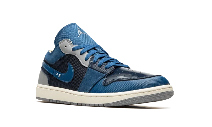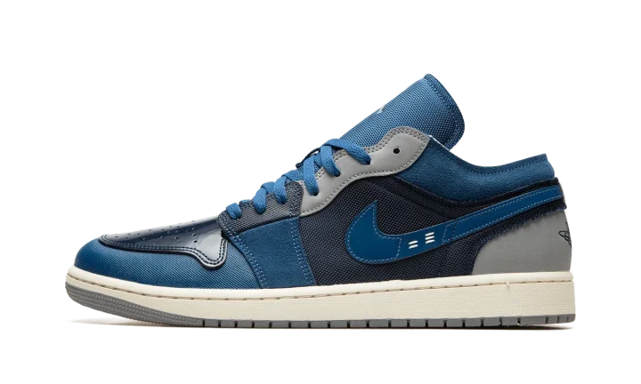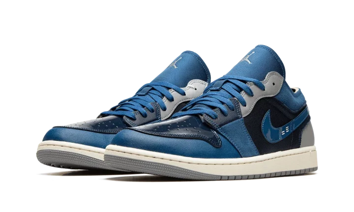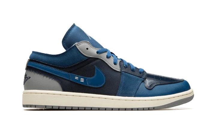The Air Jordan 1 Low Craft "Obsidian" is a blue-based colorway of the modified version of the low-top shoe made from a unique combination of materials. The "Obsidian" Jordan 1 Low Craft is from a Nike collection of reconstructed "Craft" shoes. Here, the colorway features an upper designed in a mixture of leather, suede, and other textiles in Obsidian hues. Obsidian-colored patent leather is found on the perforated toe. Additional Obsidian accenting appears on the mesh mid-panel and mesh lower eyelet. French Blue detailing lands on the mesh toe cap, on the suede eyelet and suede collar, as well as on the leather Swoosh. Release date: November 8, 2022