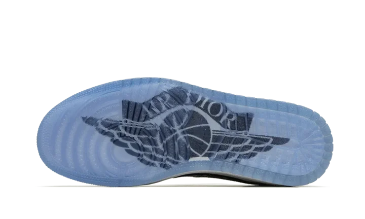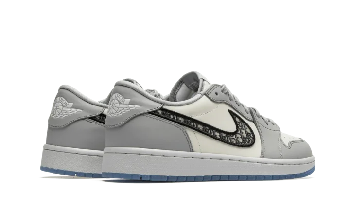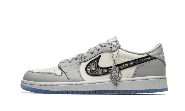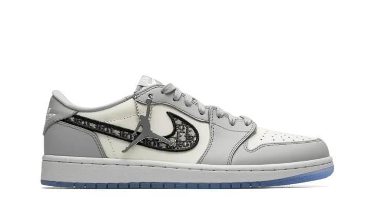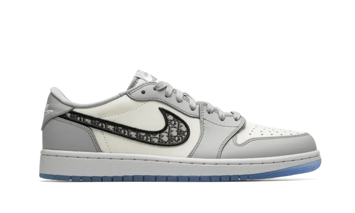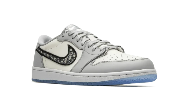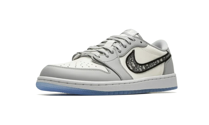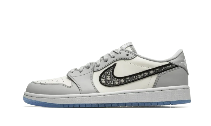 The Dior x Air Jordan 1 Low is one of two extremely limited edition colorways of Michael Jordan's first signature shoe created by high fashion house Dior, in Italy. In what is arguably the most desirable sneaker collaboration of 2020, the Dior x Jordan 1 collection promptly sent waves throughout both the fashion and sneaker scenes when Dior's Creative Director, Kim Jones, announced the partnership at the Dior pre-fall show in Miami in 2020. The minimal aesthetic of Dior's Jordan 1 is underscored by the Dior grey leather overlays on the forefoot, eyelets, collar, and heel. Buttery smooth white leather forms the base of the shoe, appearing on the perforated toe and mid-panel. An embroidered monogram Swoosh covers either side and a white "Air Dior" Wings emblem graces the heel. Finishing touches include a white midsole and contrasting icy blue translucent outsole. The Dior x Air Jordan 1 Low was released on June 25, 2020.