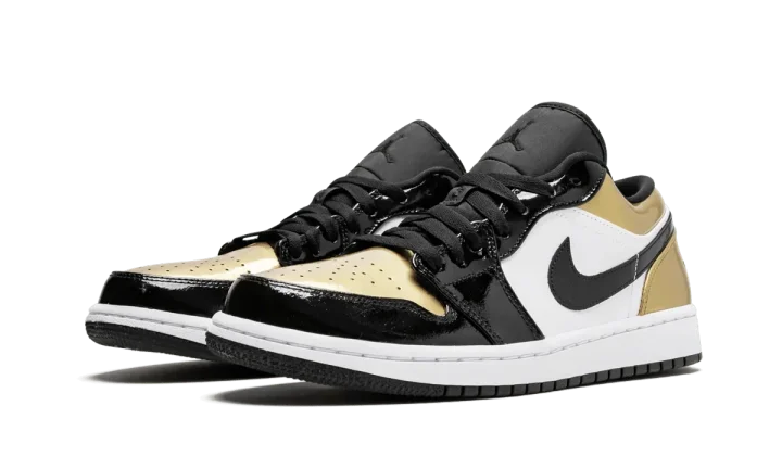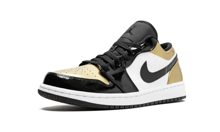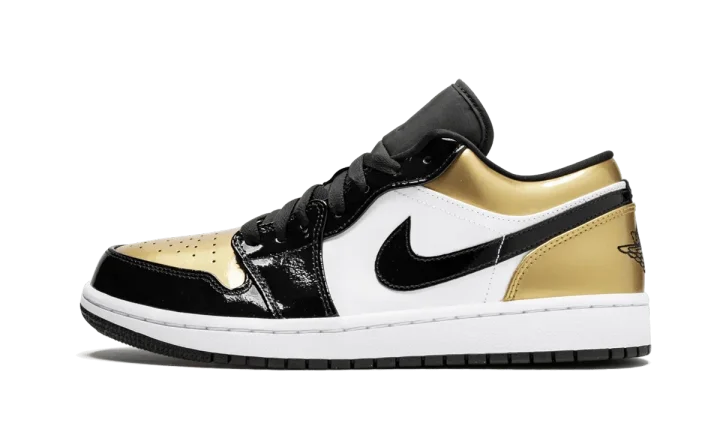 The Air Jordan 1 Low "Gold Toe" is a special release of the low-top Jordan 1 that borrows a popular colorway from the original high-top. The metallic gold, white, and black patent leather construction that first appeared on the Jordan 1 High in 2018 is mirrored on this Jordan 1 Low from 2019. Unlike the high-top's asymmetrical color blocking, this low features the same look on the lateral and medial sides. Each pair is completed with a tonal Jumpman logo embroidered on the tongue and the classic "wings" logo on the heel. The Air Jordan 1 Low "Gold Toe" released during the summer of 2019.