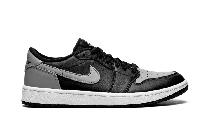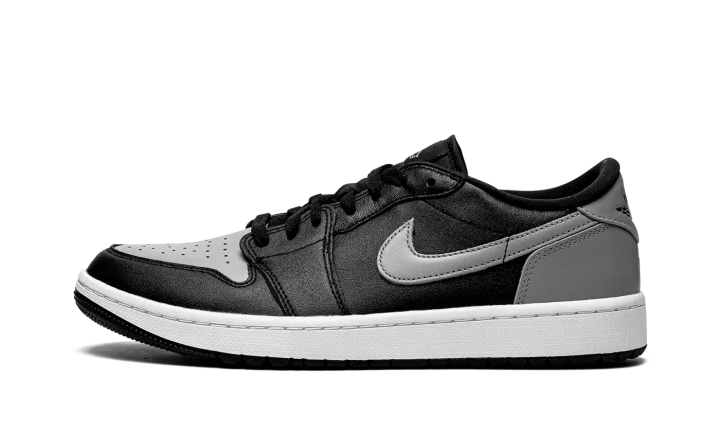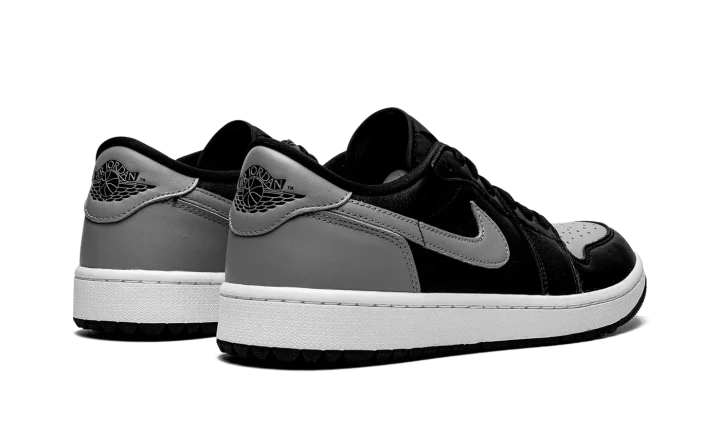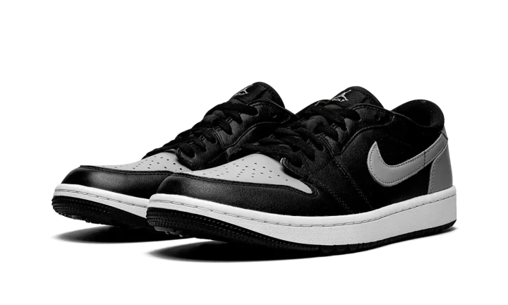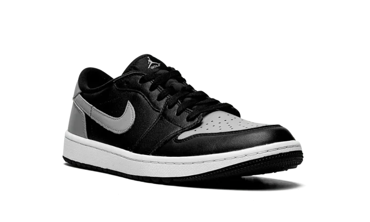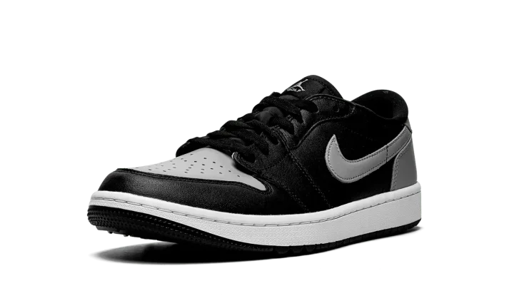 The Air Jordan 1 Low Golf "Shadow" is a modified version of the classic basketball and lifestyle shoe designed for golf in an original Jordan 1 colorway. From Jordan Brand's golf collection, which also includes several Air Jordan 1 Lows and the Air Jordan 4, the Jordan 1 Low Golf "Shadow" nods to the original, black-and-grey colorway of the vintage basketball shoe with its color block. The look replicates the styling of the original "Shadow" colorway with Medium Grey leather on the perforated toe, Swoosh, heel tab, and heel. The toe cap, forefoot, eyelets, mid-panel, and collar are designed in black leather. A black "Wings" logo is found on the back of the shoe. A grey Jumpman and "Golf" branding appear on the black nylon tongue tag. Small nubs on the outsole provide traction on a golf course. Release date: January 20, 2022