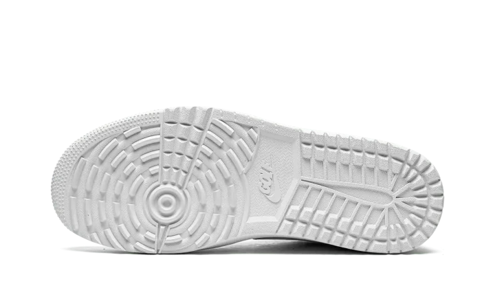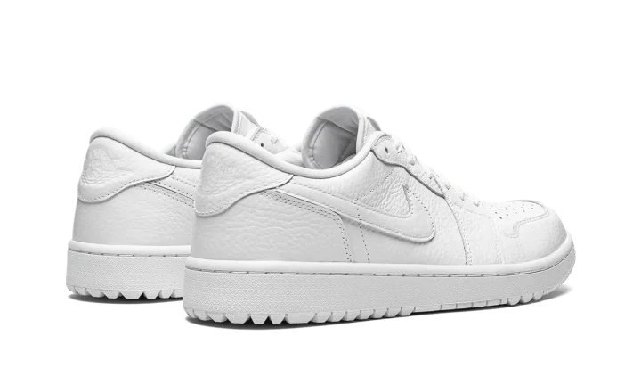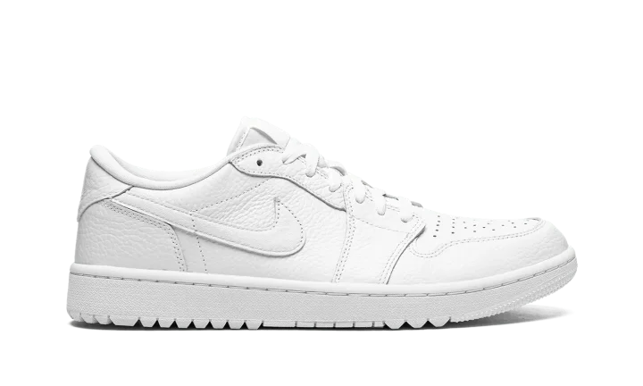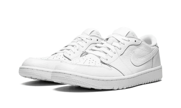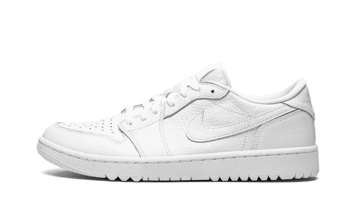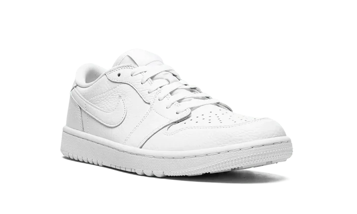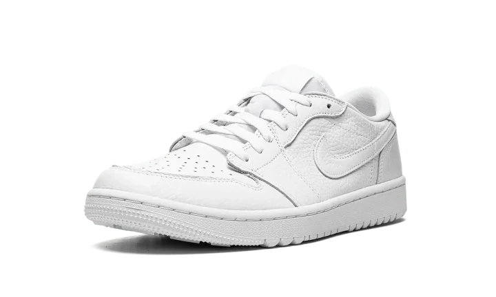 The Air Jordan 1 Low Golf "Triple White" is a monochromatic white colorway of the version of the vintage basketball shoe designed for golf. The "Triple White" is one of multiple Jordan 1 Low Golf styles released by Jordan Brand in 2022. Designed for the fairway, style elements include an all-white leather construction with a white leather Swoosh on the sides. Tonal "Wings" branding is found on the heel. Additional branding appears on the tongue tag, where a Jumpman and "Golf" detailing are found in white. Small nubs on the outsole provide traction on a golf course. Release date: March 5, 2022