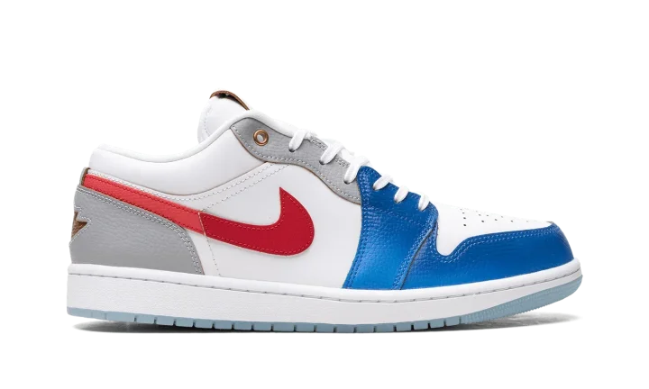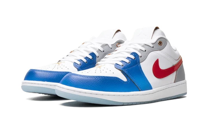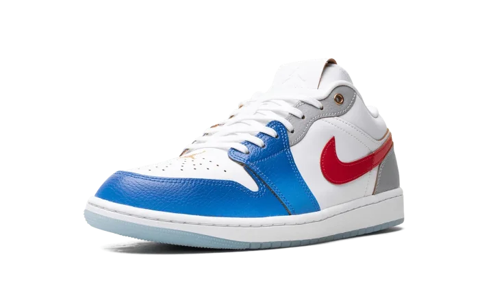 The Air Jordan 1 Low "Philippines" is a colorway of the retro basketball shoe designed in the colors of the Philippines' flag. The colorway features a white leather construction with Game Royal leather on the toe and forefoot. A University Red leather Swoosh is found on either side. Grey leather appears on the heel and on the eyelet panels. A Metallic Gold "Wings" logo is found on the heel and a Metallic Gold Jumpman is embroidered on the perforated leather toe box. The white rubber midsole and icy blue translucent rubber outsole complete the ode to the Philippines. Release date: July 20, 2023