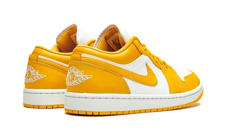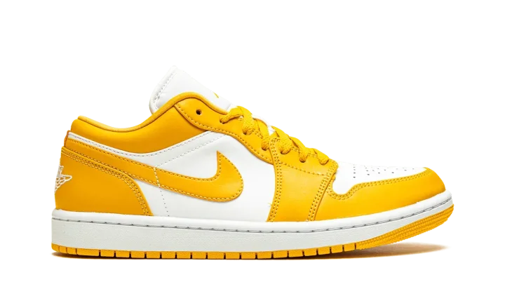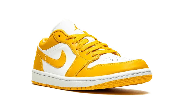 The Air Jordan 1 Low "Pollen" is a scorching hot colorway of Michael Jordan's first signature shoe in the popular low-top silhouette. Released by Jordan Brand in 2021, this "Pollen" colorway features white leather on the perforated toe and mid-panel. The forefoot, eyelets, collar, heel, and Swoosh are designed in Pollen yellow leather. A white "Wings" logo is embroidered on the back and a Pollen-colored Jumpman appears on the white nylon tongue. White "23" embroidery is stitched onto the lace overlay to complete the look.