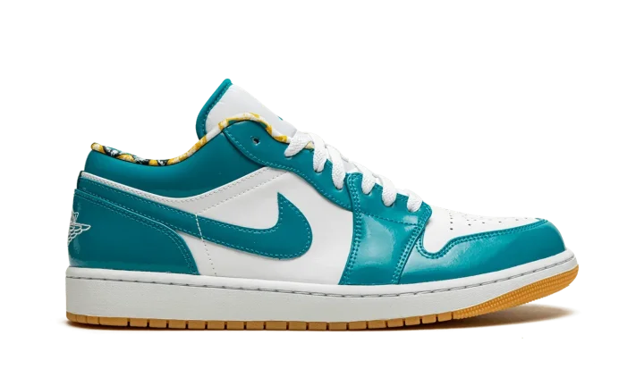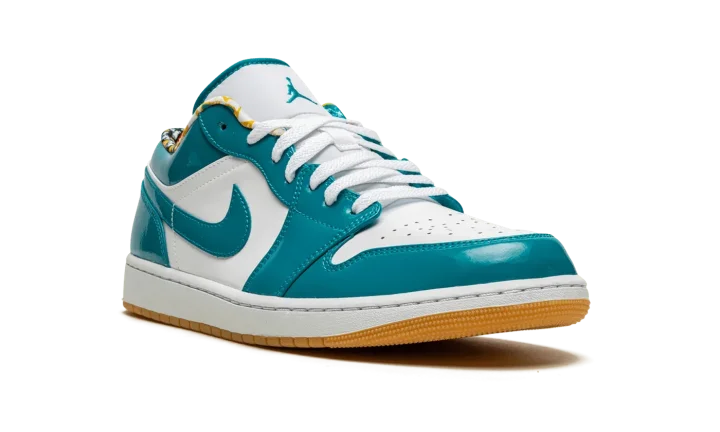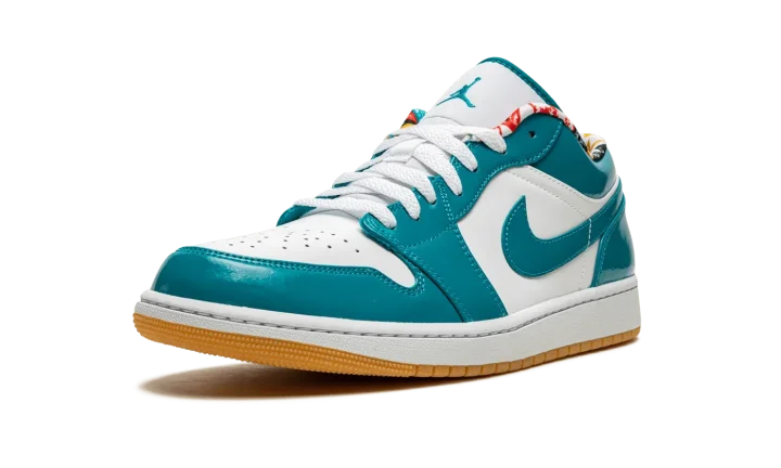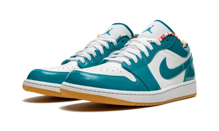 The Air Jordan 1 Low "Barcelona" is a colorway of Michael Jordan's first signature shoe in the low-top style that draws design inspiration from a sweater that Jordan wore during the '92 Summer Olympics in Barcelona. The "Barcelona" is dressed in a two-tone, white-and-Cyber Teal upper with white leather on the perforated toe and mid-panel. The overlays and Swoosh appear in glossy Cyber Teal-colored leather for a distinctive, '90s-esque look. White "Wings" branding is embroidered on the heel and a Cyber Teal Jumpman can be found on the white nylon tongue. The inner lining of both the left and right shoe feature a "Barcelona" inspired motif similar to the abstract tribal pattern found on the apparel that Jordan wore at the 1992 Olympics.