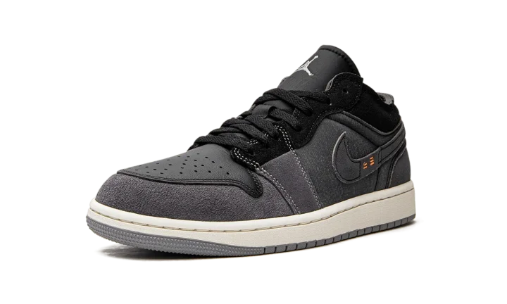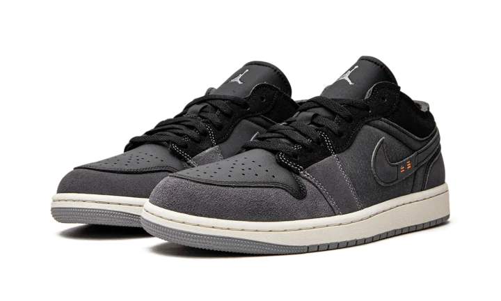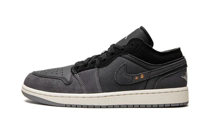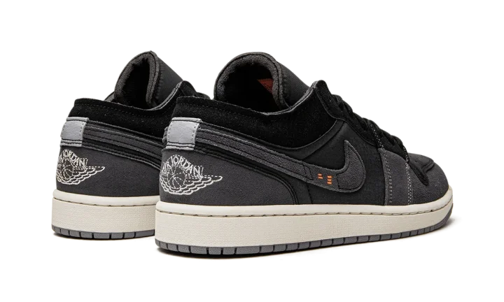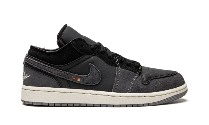 The Air Jordan 1 Low Craft "Inside Out" is a colorway of the retro basketball shoe with a unique construction. The "Inside Out," as its name implies, "reverses" the construction of the popular Air Jordan 1 Low by featuring foam padding on the outside of its design to appear as if the inside of the shoe is on the outside. Specifically, the perforated toe is designed in black leather while grey foam padding is found on the toe, forefoot, mid-panel, and heel. The material also appears on the Swoosh. A white "Wings" logo is embroidered on the back of the shoe and a white Jumpman is found on the black nylon tongue.