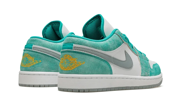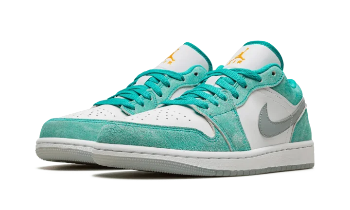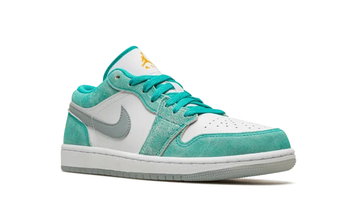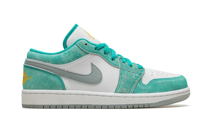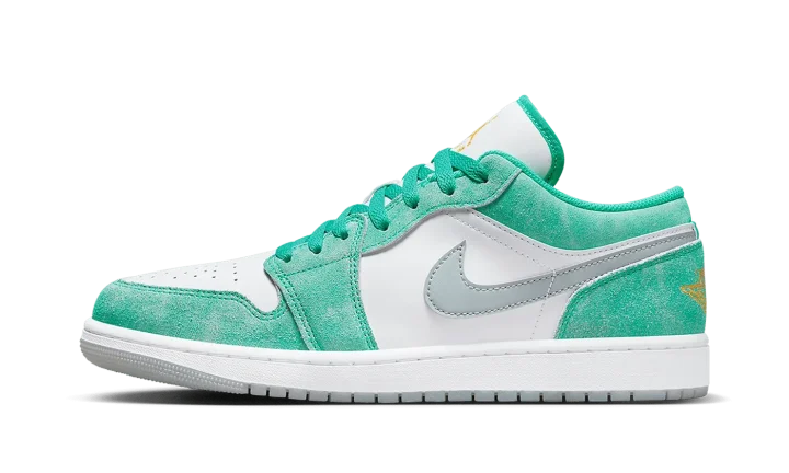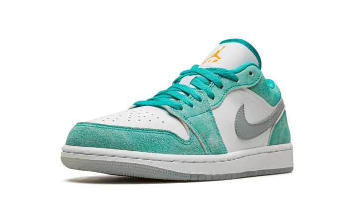 The Air Jordan 1 Low SE "New Emerald" is a clean look for the popular lifestyle shoe meant for casual wear. The "New Emerald" features white leather on its perforated toe and mid-panel. Contrasting New Emerald suede overlays contrast the neutral-colored base. A silver leather Swoosh appears on either side of the shoe while yellow "Wings" branding is embroidered on the heel. Both the Jumpman and "Air" logos on the white leather tongue are also designed in yellow. A two-tone, white midsole and grey rubber outsole completes the look. Release date: July 14, 2022