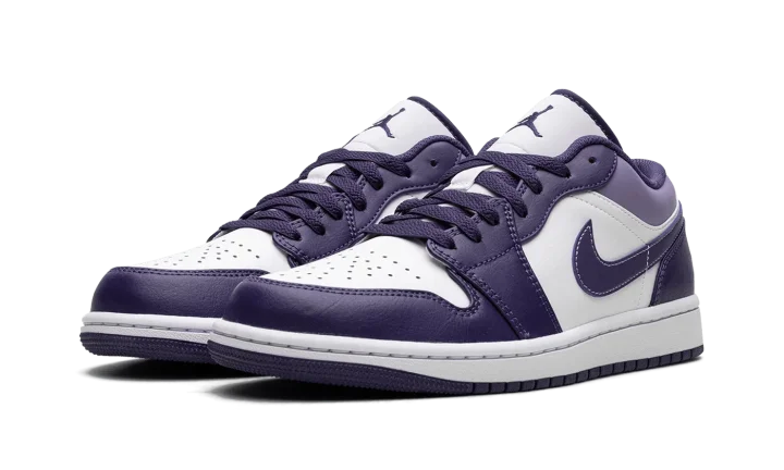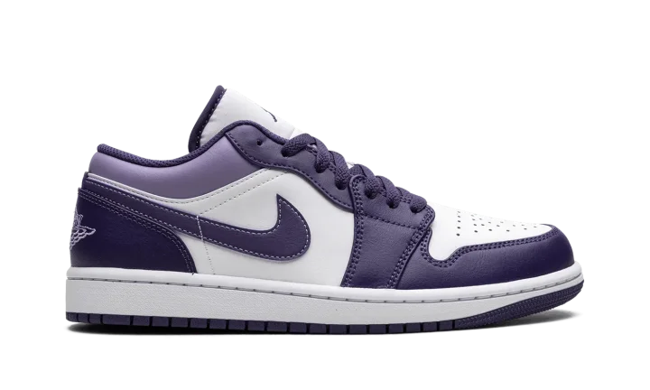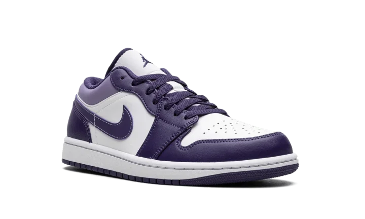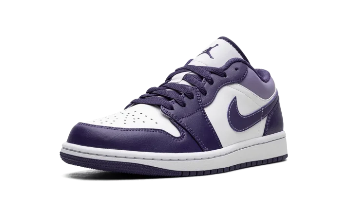 The Air Jordan 1 Low "Sky J Purple" is a colorway of the low-top retro basketball shoe with purple detailing. The colorway has a white leather construction with what Jordan Brand calls Sky J Purple leather overlays and Swoosh branding. A lighter shade of purple appears on the collar. A classic "Wings" logo is embroidered on the heel while a purple Jumpman is found on the tongue. The shoe's two-tone white-and-purple look continues underfoot with a white rubber midsole and purple rubber outsole. Release date: July 20, 2023