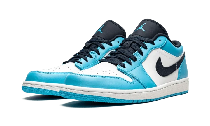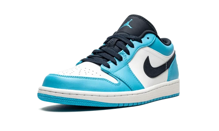 The Air Jordan 1 Low "UNC" is a college basketball-themed colorway of the low-top edition of Michael Jordan's first signature shoe. An original color option on the Air Jordan 1 by Nike from 1985, the "UNC" theme refers to the white-and-blue team uniform colors of the North Carolina Tar Heels, Michael's alma mater. Where many "UNC" inspired Air Jordans feature University Blue accents, the Jordan 1 Low seen here opts for Powder Blue detailing. The Powder Blue shade previously appeared on the original Air Jordan 9 "Powder Blue" in 1993 and on the Air Jordan 10 of the same nickname in 1994. On this shoe, white leather can be found on the perforated toe and mid-panel. Contrasting Powder Blue overlays appear on the forefoot, eyelets, collar, and heel. An Obsidian (dark blue) leather Swoosh with subtle Powder Blue contrast stitching graces both sides and a "Wings" logo is embroidered onto the heel. A blue Jumpman appears on the dark blue nylon tongue and tonal "23" branding can be found on the black lace overlay.