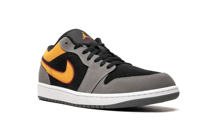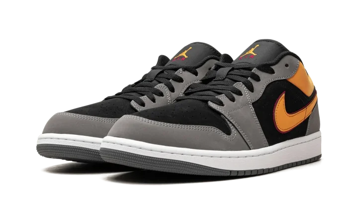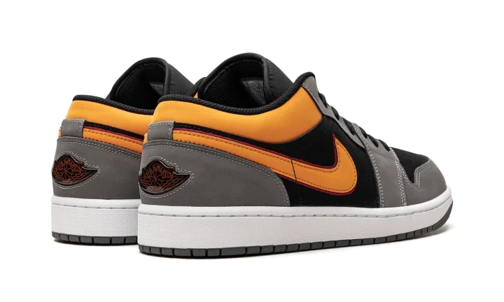 The Air Jordan 1 Low "Vivid Orange" is a colorway of the retro basketball shoe that stands out with eye-catching orange accents. The upper features a black synthetic nubuck base with Light Graphite overlays. A leather Vivid Orange Swoosh is located on either side of the shoe, matching font found on the "Wings" logo on the heel. More Vivid Orange accenting is seen on the collar and Jumpman logo on the tongue. A white rubber midsole and black rubber outsole complete the look. Release date: August 29, 2023