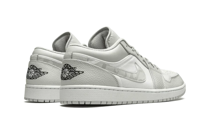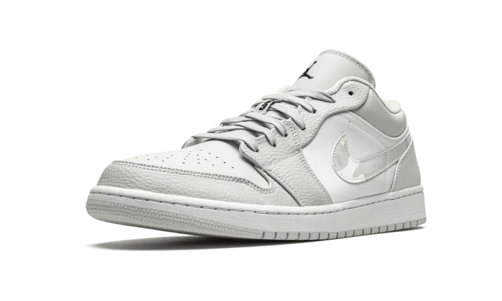 The Air Jordan 1 Low "White Camo" is a versatile and desirable low-top version of Michael Jordan's signature shoe with a subtle camouflage pattern. This refined look for the Jordan 1 Low features light grey tumbled leather overlays on the forefoot and eyelets. Contrasting white perforated leather appears on the toe and a smooth variant of the material covers the mid-panel. Branding, like the "White Camo" leather Swoosh located on either side, as well as the mini black Jumpman embroidery the tongue and "Wings" emblem on the heel, add classic styling to the Air Jordan 1.