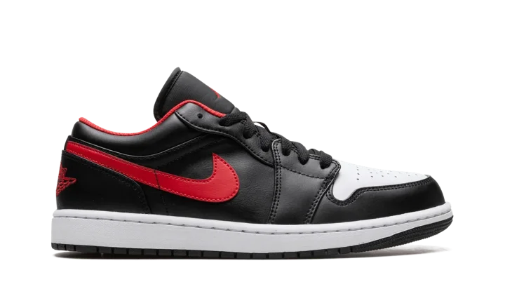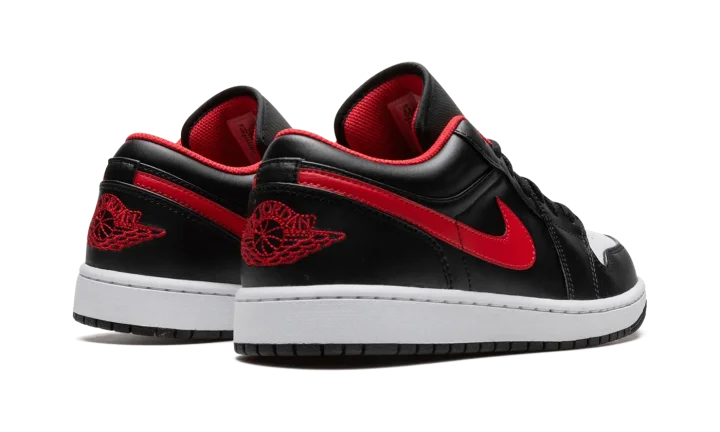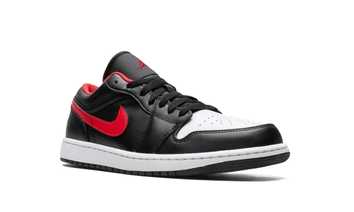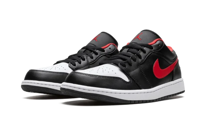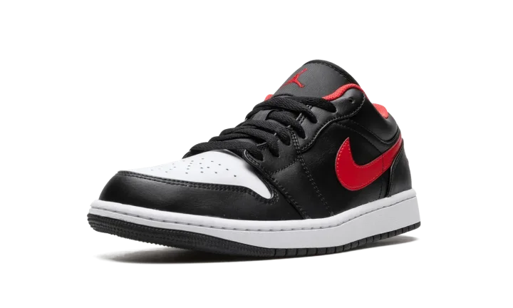 The Air Jordan 1 Low "White Toe" is a colorway of the retro basketball shoe that features the Chicago Bulls' black, white, and red team uniform colors on its design. The "White Toe" isn't affiliated with the Bulls, but still draws favorably from Michael Jordan's former team by applying its uniform colors on its leather panels. The perforated toe is designed in white leather. The rest of the upper, sans the red leather Swoosh, appears in black leather. A fiery red "Wings" logo is embroidered on the heel and a red Jumpman is stitched onto the black nylon tongue. Underfoot, a white midsole and black rubber outsole complete the look.