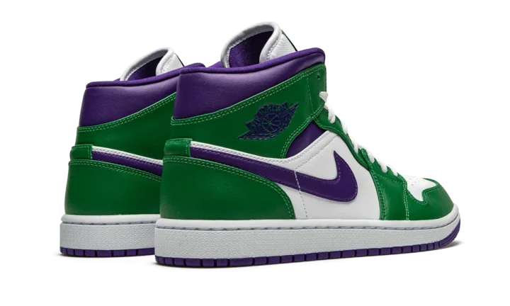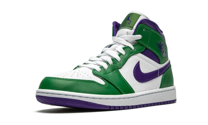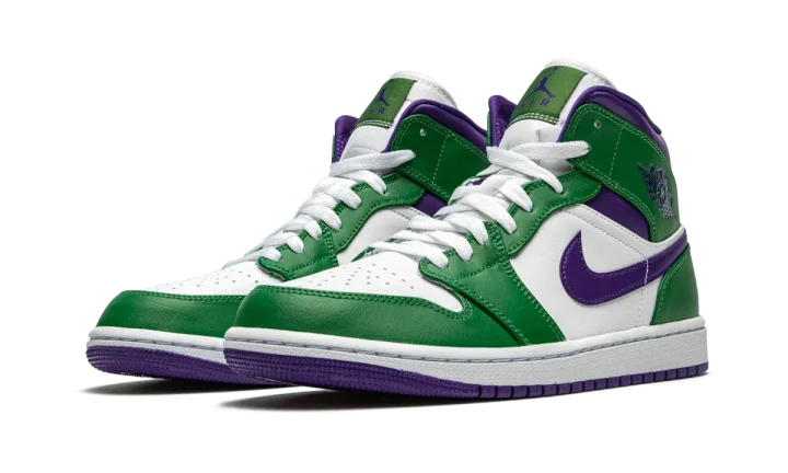 The Air Jordan 1 Mid "Aloe Verde/Court Purple" is yet another fresh look of Michael Jordan's first signature shoe in mid-top form. Employing a color scheme reminiscent of a certain anthropomorphic turtle cartoon character, the upper features vibrant green leather overlays covering the forefoot, collar, and heel. A clean white leather base appears on the mid-panel and perforated toe. Purple accenting dots the Swoosh hit on the mid-panel as well as on the padded collar. Purple Wings detailing on the collar and purple Jumpman branding on the green nylon tongue tab complete the look.