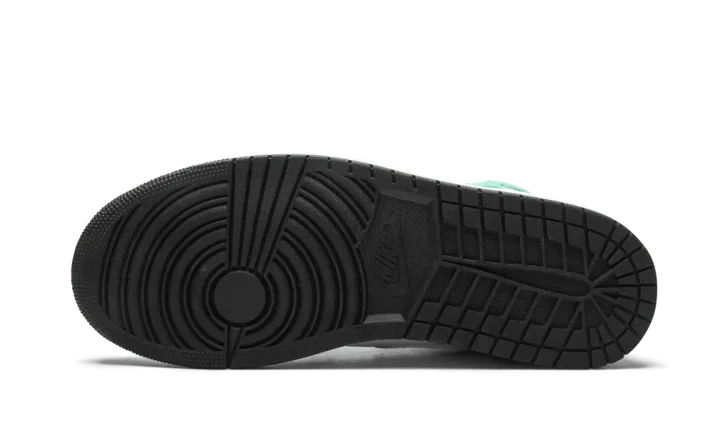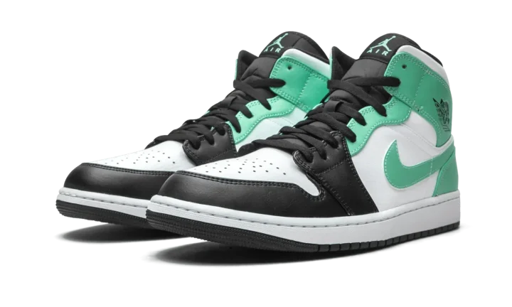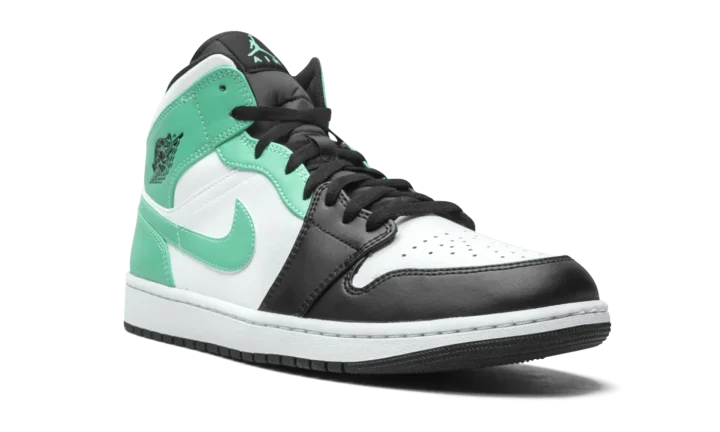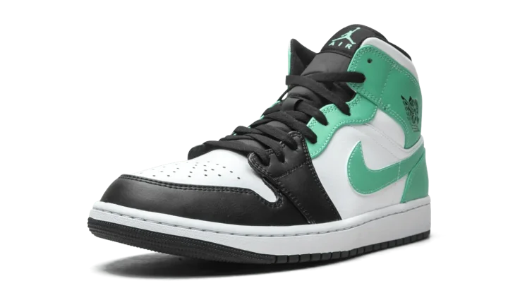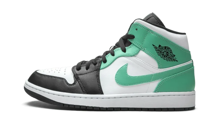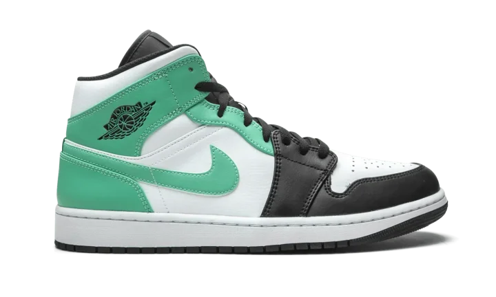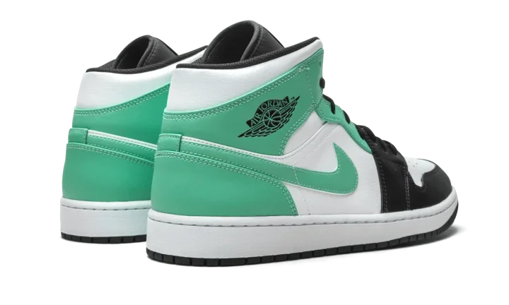 The Air Jordan 1 Mid "Island Green" is a tropical inspired look for the popular mid-top edition of Michael Jordan's first signature shoe. Taking inspiration from the color block of the Air Jordan 1's "Bred Toe" colorway, an original and iconic look that was released by Nike in 1985, the "Island Green" features black leather on the forefoot and lower eyelets and white leather on the perforated toe and mid-panel. Tropical Island Green leather graces the upper eyelets, collar, heel, and Swoosh branding found on both sides. A black "Wings" logo can be found on the collar and an Island Green accented Jumpman with "Air" underneath appears on the black nylon tongue tag. A black nylon tongue and laces allow for the aforementioned branding to attract attention. Jordan Brand rounds out the look with a white rubber midsole and black outsole. This colorway is being compared favorably to the rare "Igloo" Air Jordan 1 High.