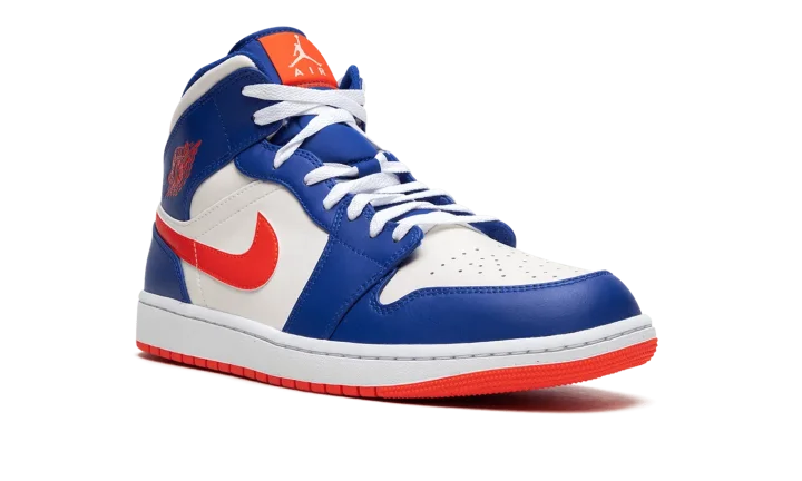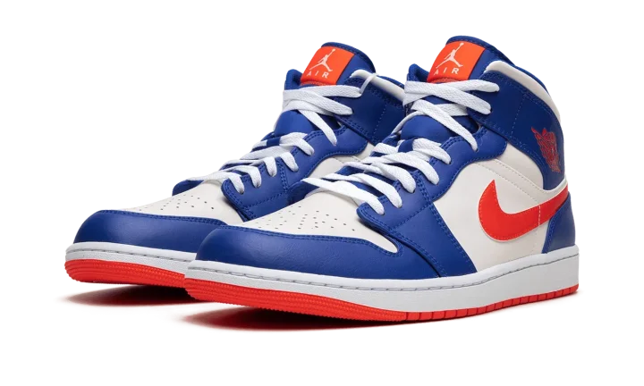 The Air Jordan 1 Mid "Knicks" is a colorway of the casual sneaker that features the team uniform colors of the New York Knicks. The "Knicks" Jordan 1 Mid is not officially associated with the basketball team, but still features its uniform colors on its design in an intriguing way. The shoe sports a white leather base with Game Royal leather overlays on the toe, forefoot, eyelets, collar, and heel. A Rush Orange leather Swoosh is found on either side of the shoe and orange "Wings" branding appears on the collar. The Rush Orange nylon tongue tag features Jumpman and "Air" detailing. Underfoot, the white midsole is paired with an orange rubber outsole. Release date: February 17, 2023