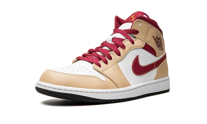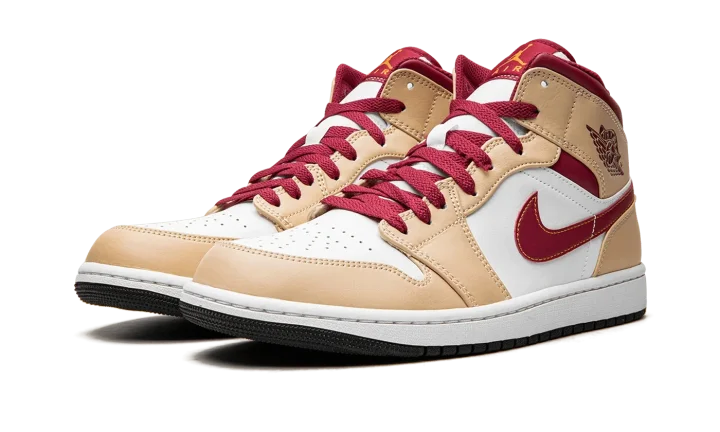 The Air Jordan 1 Mid "Light Curry" is another casual colorway of the popular silhouette that can be worn with virtually anything it's paired with. The "Light Curry" features a white leather base with Light Curry leather overlays throughout the design. A maroon leather Swoosh appears on either side of the shoe. Additional maroon accenting comes into play on the "Wings" branding on the collar, on the tongue tag with Jumpman insignia, and on the laces. A white midsole and black rubber outsole complete the look. Release date: April 26, 2022