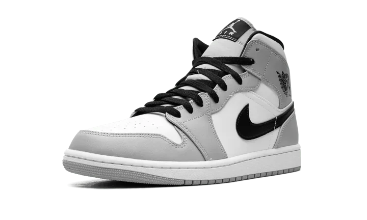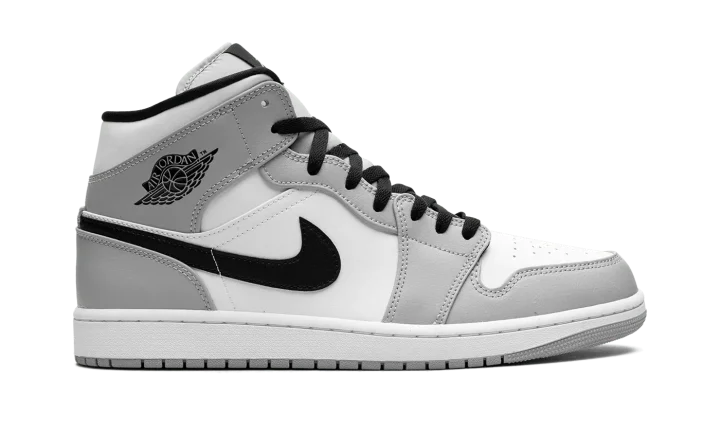 The Air Jordan 1 Mid "Light Smoke Grey" finds Michael Jordan's first signature shoe in mid-top form in a shadowy, ultra versatile color scheme. The Jordan 1 Mid has gained popularity in sneaker culture for its unique mid-top shape and range of desirable colorways. Both aspects come into play on the "Light Smoke Grey" colorway. White leather forms the base of the upper, appearing on the perforated toe, mid-panel, and collar. Light Smoke Grey leather overlays can be found on the forefoot, eyelets, collar, and heel. A black leather Swoosh is located on each side and black "Wings" branding dots the collar. Jordan Brand finishes off the look of this subdued design with a grey nylon tongue, black laces, and black nylon tongue tab with grey Jumpman detailing. The Air Jordan 1 Mid "Light Smoke Grey" was released on June 9, 2020.