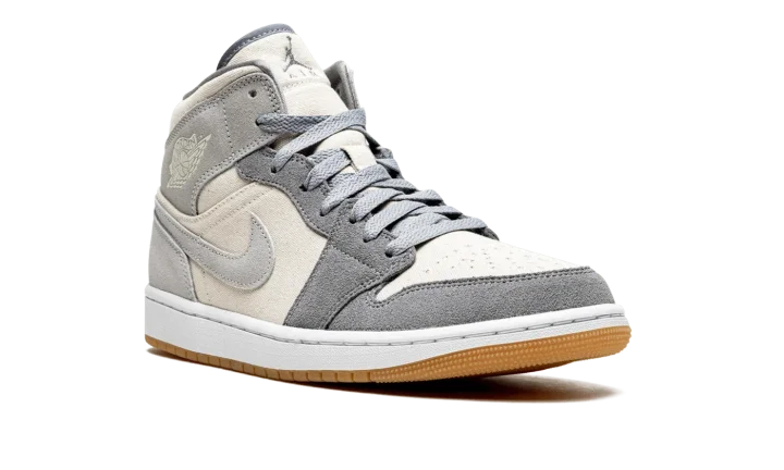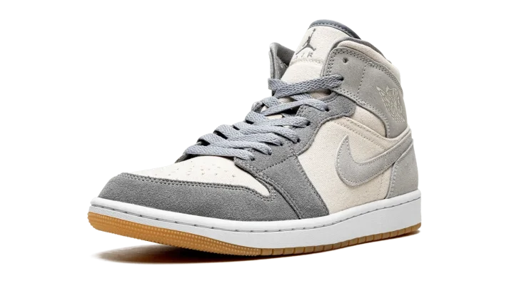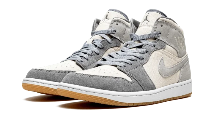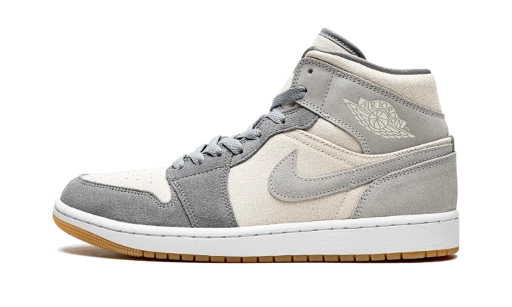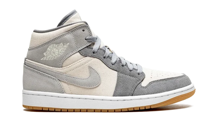 The Air Jordan 1 Mid SE "Coconut Milk" is a versatile look for the mid-top version of Michael Jordan's first signature shoe that combines a cream-colored base with grey suede overlays. From Jordan Brand's Spring 2022 collection, the "Coconut Milk" colorway features a coconut-colored canvas base with contrasting Particle Grey suede overlay panels and Swoosh branding. A classic "Wings" logo appears on the collar. A Particle Grey Jumpman with "Air" branding is embroidered on the top of the Coconut Milk canvas tongue. Both the laces and interior lining are designed in grey. Underfoot, the white rubber midsole is matched to a gum-colored outsole to complete the look.