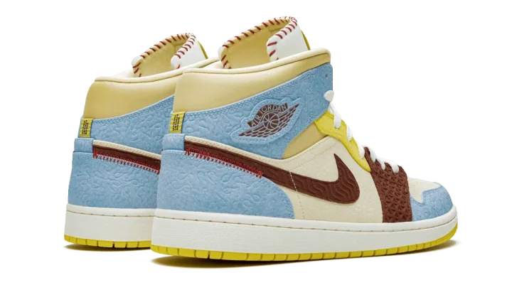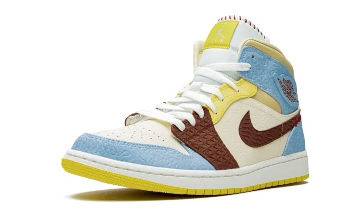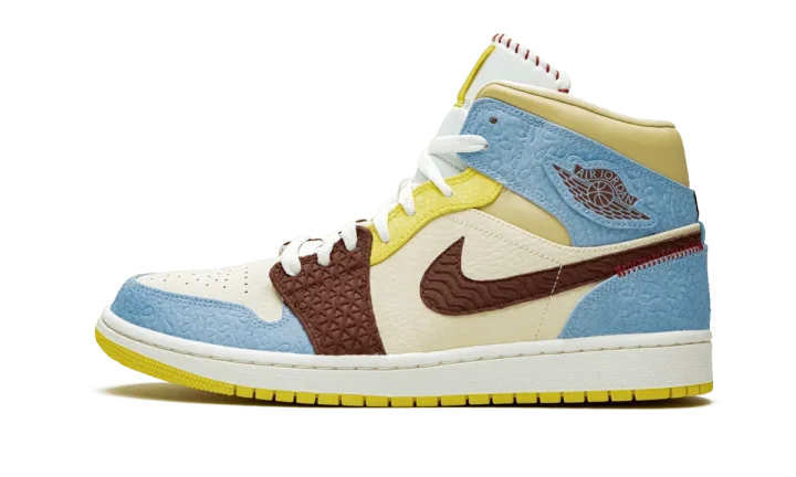 The Maison Chateau Rouge x Air Jordan 1 Mid "Fearless" is the Paris-based brand's vision of the mid-top version of Michael Jordan's first signature shoe. Maison Chateau Rouge is known for their African-inspired apparel for men and women and the collective applies its trademark designs liberally to the upper of the silhouette, via textured leather paneling. A tan leather base can be found on the mid-panel, perforated toe, and ankle collar, while dark brown textured leather covers the forefoot panel and Swoosh. Light blue debossed leather covers the toe, ankle collar and heel. Red exposed stitching outlining the tongue and at the heel enhances the hand-constructed theme of the shoe. Release date: November 30, 2019.