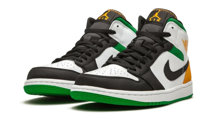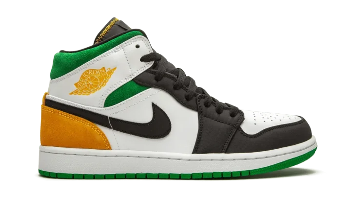 The Air Jordan 1 Mid "Oakland" features a color scheme that calls to mind the Oakland Athletics baseball team. In no way a collaborative effort between the major league baseball team and Jordan Brand, the color scheme of this design nonetheless mirrors that of the Athletics' team uniform colors. The upper features white leather detailing on the perforated toe, mid-panel, and collar overlay. Contrasting black nylon paneling can be found on the forefoot, eyelets, and Swoosh branding on either side. A black nylon tongue with Laser Orange exposed stitching on the top and Jumpman insignia on the tongue tag add to the unique appearance of this Jordan 1 Mid. Green suede is located around the collar. An additional patch of suede, this time in a washed orange hue, dots the lower heel.
