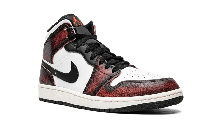 The Air Jordan 1 Mid SE "Wear-Away - Infrared" is a colorway of the mid-top sneaker with wear-away overlays. Very loosely inspired by the Air Jordan 1's original "Chicago" colorway, the "Wear-Away - Infrared" features a similar color block to the iconic shoe, but with a few noticeable modifications. The shoe has a white leather base that's contrasted with Infrared-colored leather overlays with a wear-away black pattern. A black leather Swoosh is found on the sides and a black "Wings" logo appears on the collar. An Infrared Jumpman appears on the tongue.