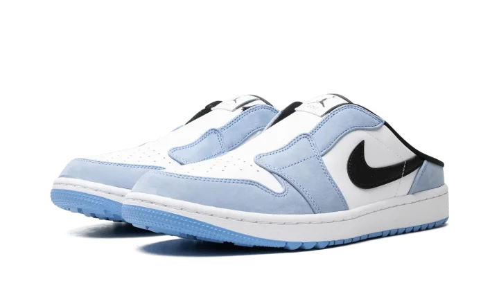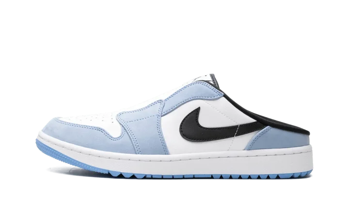The Air Jordan Mule Golf "University Blue" is a mule-style golf shoe inspired by the Air Jordan 1 Low in a "UNC" inspired colorway. An evolution of the Air Jordan 1 Low Golf, the Jordan Mule Golf debuted in 2024 and is an ideal option for post-activity wear or for the golf course. The shoe features a white leather base with University Blue suede overlays and a black leather Swoosh on the sides. The shoe's mule-style construction allows for easy slip-on entry and exit. Underfoot, ridges on the outsole ensure traction on or off the fairway. Release date: March 21, 2024