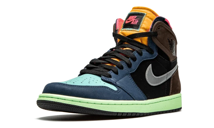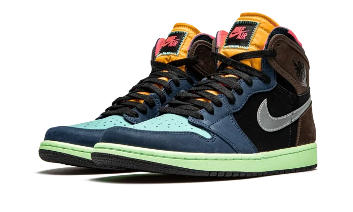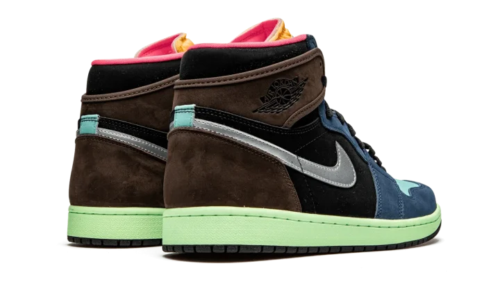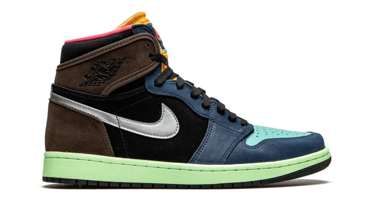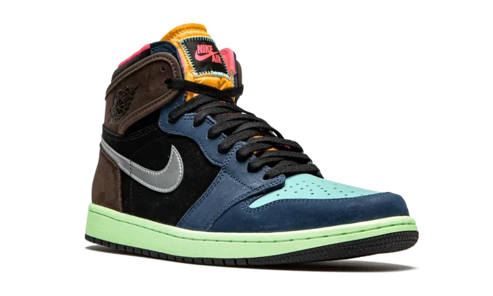 The Air Jordan 1 High "Bio Hack" is a daring new colorway of Michael Jordan's first signature shoe that loosely resembles a special collaboration in Jordan Brand's history. The "Bio Hack" pulls inspiration from Undefeated's mid-2000s Nike SB Dunk colorway in which various contrasting colors were joined together to form one of the most daring Jordan 1s of the era. Differing slightly from the "OG" look it draws favorably from, the "Bio Hack" nonetheless displays a totally mixed-up appearance, beginning with a Baroque Brown collar and heel that looks to have been used on Travis Scott's Air Jordan 1 from 2019. Elsewhere, a Metallic Silver leather Swoosh appears on the black nubuck mid-panel, and the perforated toe is finished off in teal suede. The vibrant Laser Orange nylon tongue and tonal laces add a welcomed burst of color. Release date: September 2020.