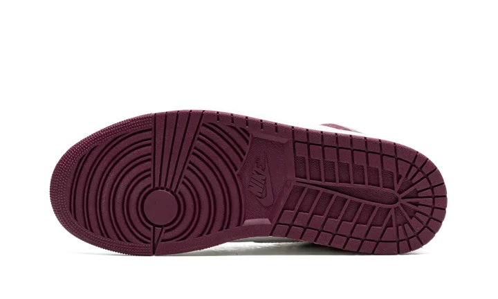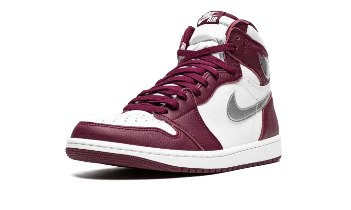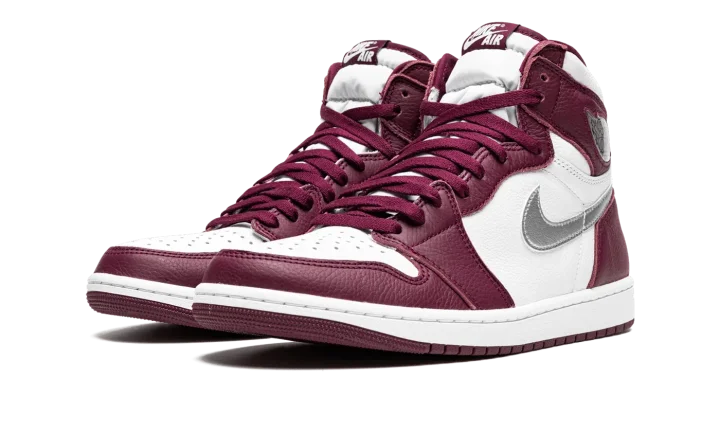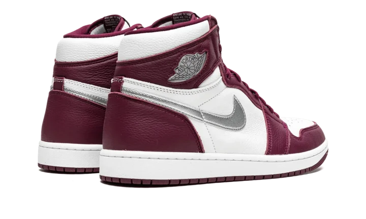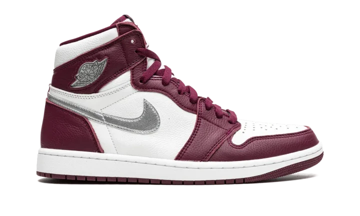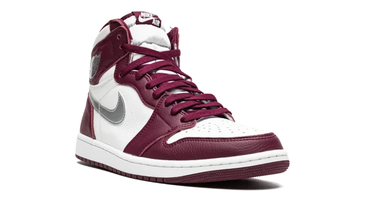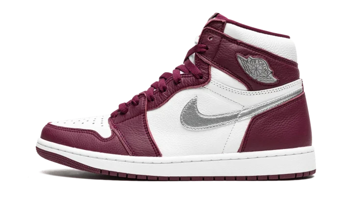 The Air Jordan 1 High OG "Bordeaux" is a November 2021 release of the iconic basketball shoe in an autumn-inspired colorway. The "Bordeaux" nickname has appeared on several classic Air Jordan styles, including the original Air Jordan 7 in the early '90s and the Air Jordan 6 in 2021. Here, Michael Jordan's first signature shoe continues the popular color theme with a mostly two-tone, white-and-maroon-colored look. Specifically, the perforated toe, mid-panel, and collar are designed in white tumbled leather. Contrasting wine-red Bordeaux leather can be found on the forefoot, eyelets, collar, and heel. A Metallic Silver leather Swoosh graces both sides of the shoe and a silver "Wings" logo is located on the collar. Classic white "Nike Air" branding is printed on the Bordeaux nylon tongue tag on the top of the white nylon tongue. Release date: November 20, 2021