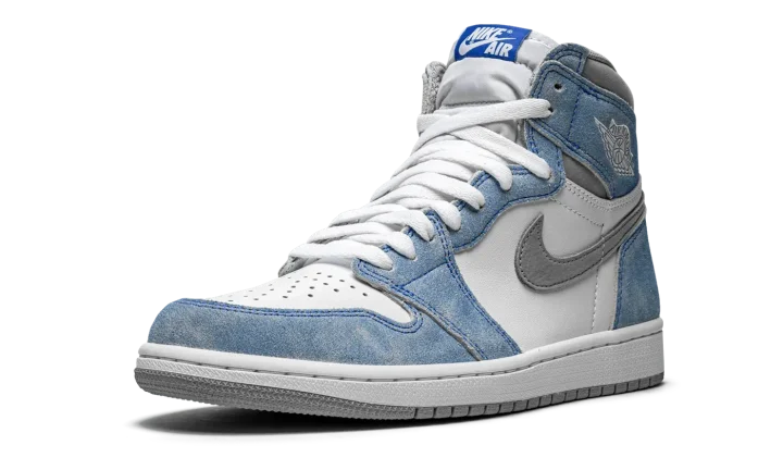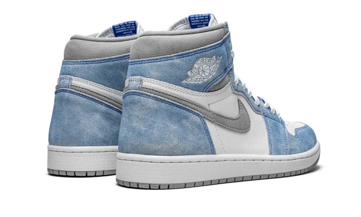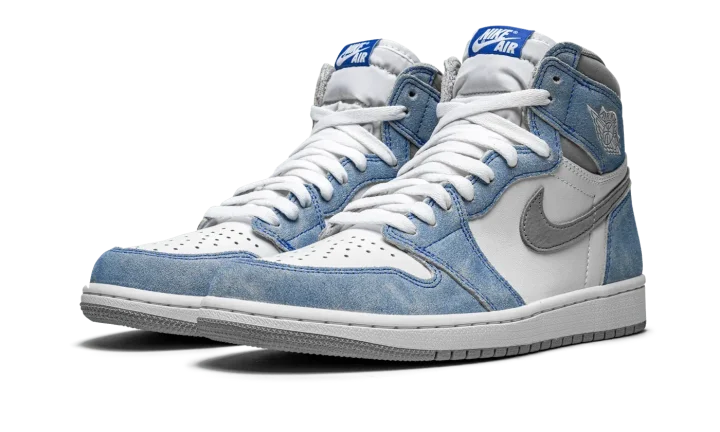 Blue/light grey/white leather Air Jordan 1 Retro High "Hyper Royal" sneakers from JORDAN featuring signature Air Jordan Wings logo, signature Swoosh logo detail, contrasting panel detail, round toe, front lace-up fastening, logo patch at the tongue, ankle-length and rubber sole. These styles are supplied by a premium sneaker marketplace. Stocking only the most sought-after footwear, they source and curate some of the most hard to find sneakers from around the world..