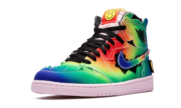 The J Balvin x Air Jordan 1 High OG "Colores Y Vibras" is a Holiday 2020 collaboration between the popular Latin artist and Jordan Brand on Michael Jordan's first signature shoe. With the release of the "Colores Y Vibras," which translates to "Colors and Vibes" in English, the Colombia native becomes the first Latin musician to collaborate with Jordan Brand, a monumental achievement. As for the design, the upper features a canvas construction with a rainbow-like assortment of colors baked into its look. Jagged panels on the collar, eyelets, heel, and forefoot further the singular look of J Balvin's design. Other details include multicolor sewn-on Swooshes on either side, a black "Wings" emblem on the collar, and a pink nylon tongue with mismatching tongue tags that feature an orange patch with a black Jumpman on the right shoe and a green patch with a yellow smiley face on the left shoe. Exposed foam breaks through the top of the jagged collar and the artist's yellow smiley face arrives in patch form on the heel. A light pink sole completes the look of one of most eccentric Air Jordan 1s ever designed. Release date: December 8, 2020.