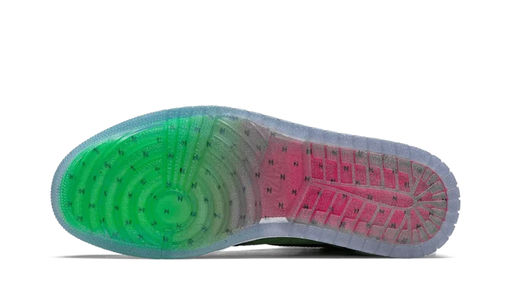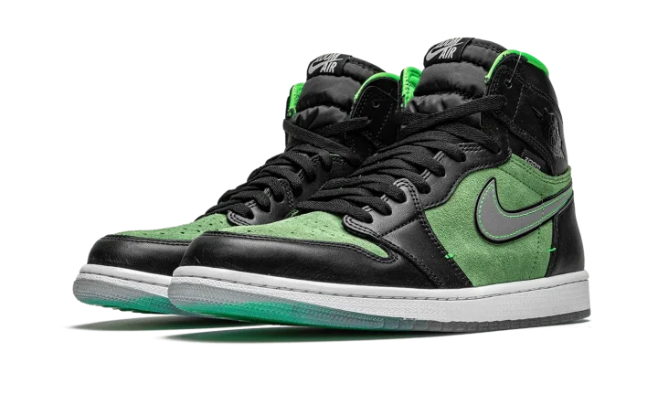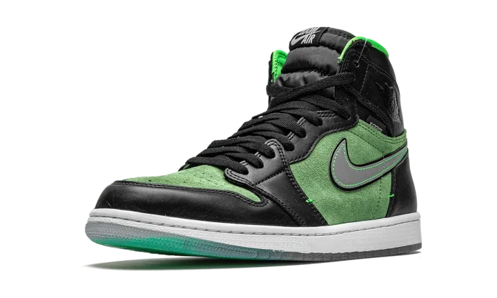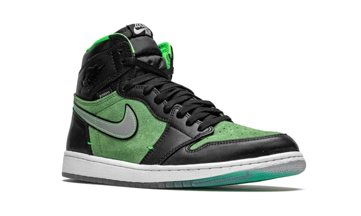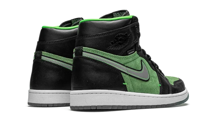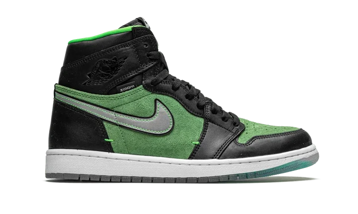 The Air Jordan 1 High Zoom "Zen Green" incorporates Zoom Air technology into the sole of Michael Jordan's first signature shoe. The Jordan 1 Zoom model made its debut late in 2019 to much success. Now, Jordan Brand returns with this "Zen Green" design as part of its Summer 2020 release cycle, and the results are clearly as favorable. Hairy Zen Green suede dots the perforated toe and mid-panel. Supple black leather overlays can be found on the forefoot, eyelets, collar, and heel. A Silver Metallic Swoosh is located on the mid-panel and features contrasting green stitching. Tonal "Wings" detailing appears on the collar and a mini nylon Zoom tag can be found on the mid-panel beneath the collar. A vibrant neon green sock liner contrasts the black nylon tongue. As previously mentioned, Zoom Air cushioning is embedded within the sole to provide the wearer ample amounts of support. Release date: August 14, 2020.