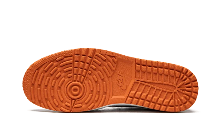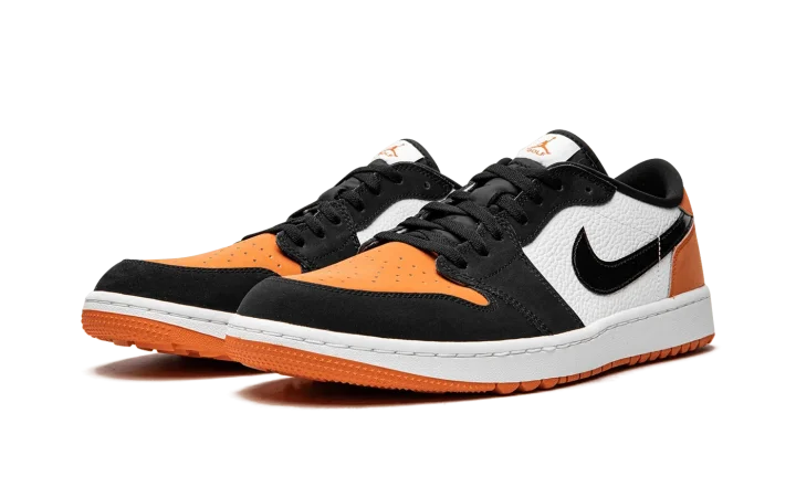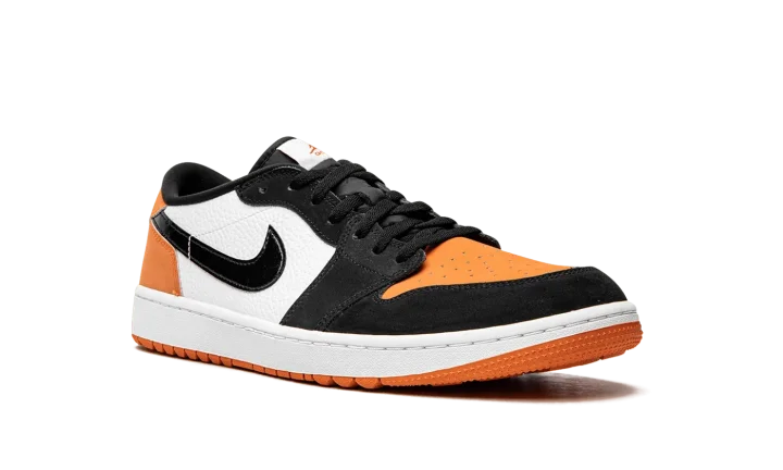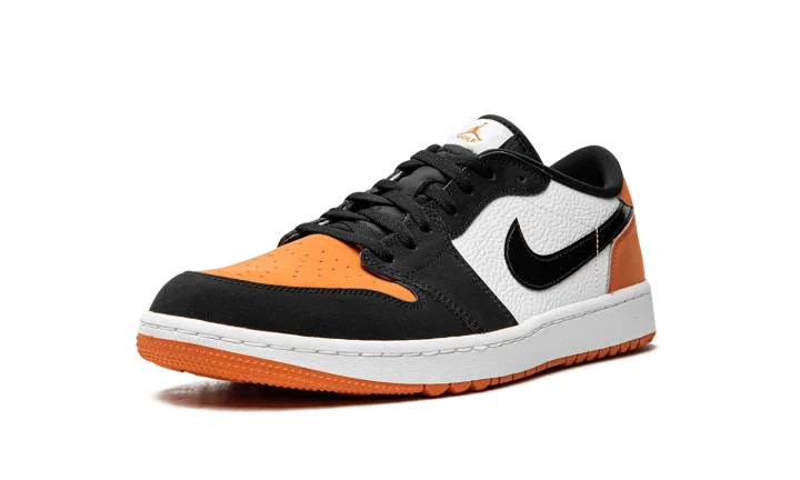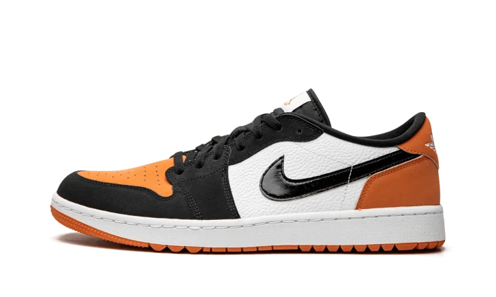 The Air Jordan 1 Low Golf "Shattered Backboard" is a modified version of the retro basketball shoe designed for golf in a popular Jordan 1 colorway. The "Shattered Backboard" theme was introduced into the Air Jordan collection in 2015, and is an homage to the overseas exhibition game that Michael Jordan participated in after his rookie season in the NBA. During the game, Jordan famously broke and shattered a glass backboard following a thunderous slam dunk. Here, the "Shattered Backboard" color story appears on the Jordan 1 Low Golf for the first time. The design features Starfish-colored leather on the perforated toe and on the heel. The mid-panel is designed in white leather. The toe cap, forefoot, and eyelets appear in black synthetic nubuck. A glossy black leather Swoosh is found on either side of the shoe while a white "Wings" logo resides on the heel. A Starfish Swoosh with "Air" branding appears on the tongue tag. Small nubs on the outsole provide traction on a golf course. Release date: June 1, 2022