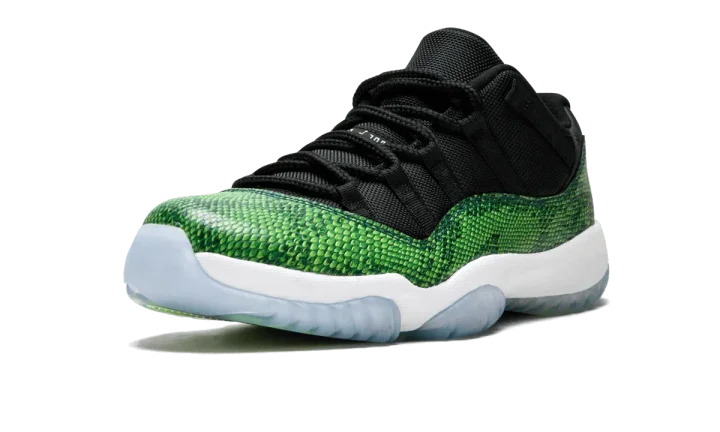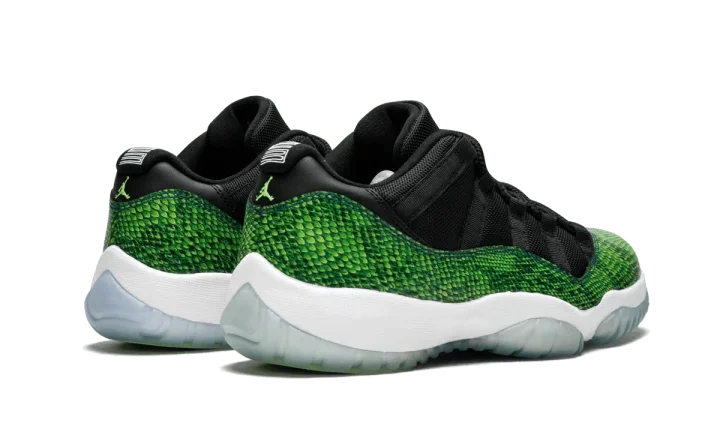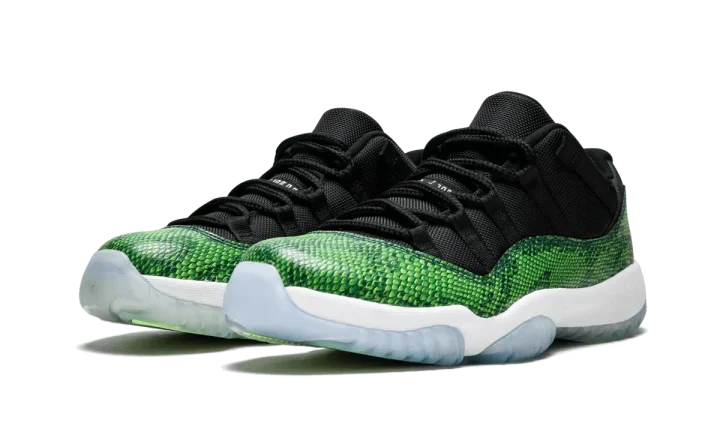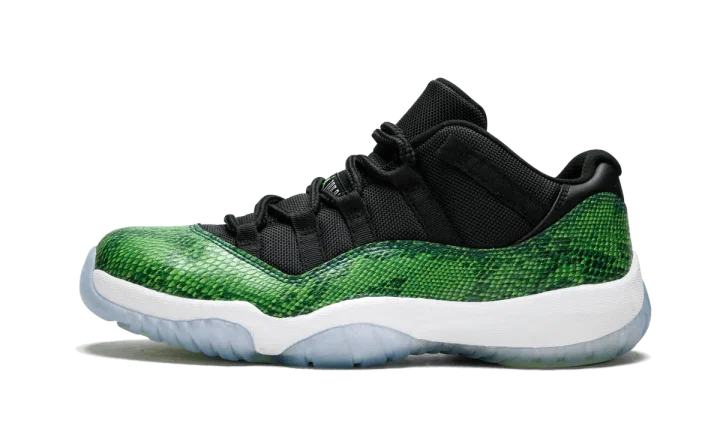 Snakeskin was back on the Air Jordan 11 Low in 2014, with the silhouette presented in this mean colorway featuring a black upper with vibrant green snakeskin for the most exotic look on the shoe ever.