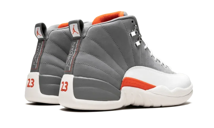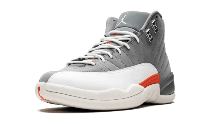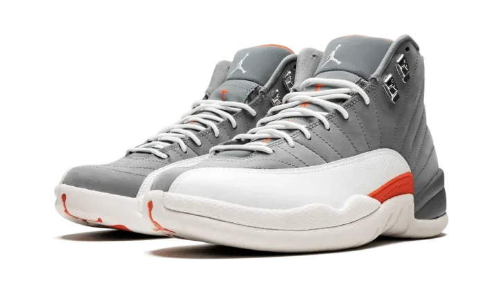 This "Cool Grey" version of the Air Jordan 12 Retro from 2012 features a grey nubuck upper with white accents to complete the original color block, then accented with orange.