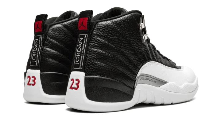 The Air Jordan 12 "Playoffs 2022" is a February 2022 release of an original colorway of the retro basketball shoe that was worn by Michael Jordan during the 1997 NBA Playoffs. An All-Star Weekend 2022 release, the Jordan 12 "Playoffs" celebrates the shoe's 25-year anniversary in spectacular fashion as the modern incarnation of the shoe is a one-to-one remake of the original version from '97. The shoe features a black leather upper with contrasting Metallic Silver eyelets. Textured white leather is found on the toe, mudguard, and midsole. A silver "Jumpman" plate appears on the branding plate on the lateral side of the shoe. The black leather tongue displays a red embroidered Jumpman and "Two3" branding. Red "23" and "Jordan" branding can be found on the back of the black rubber midsole and heel, respectively. Overall, the February 2022 release of the Air Jordan 12 "Playoffs" is consistent with the original version from 1997. Release date: February 19, 2022