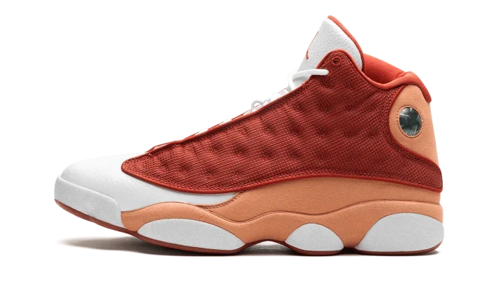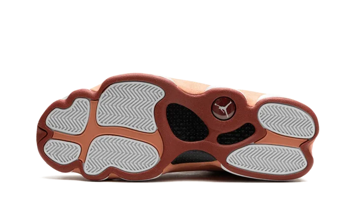 The Air Jordan 13 "Dune Red" is a colorway of the retro basketball shoe inspired by Mars exploration. The Jordan 13 in the "Dune Red" style is complete with a Dune Red and Terra Blush suede color combination on its dotted upper and mudguard. The toe and tongue are constructed in white leather to match the color of the midsole walls. The colorway retains the Jordan 13's original panther eye-inspired holographic emblem on the collar. A classic Jumpman appears on the white leather tongue. A "Jordan" tab is seen on the vamp. Release date: Summer 2024