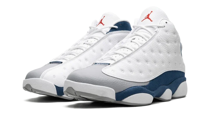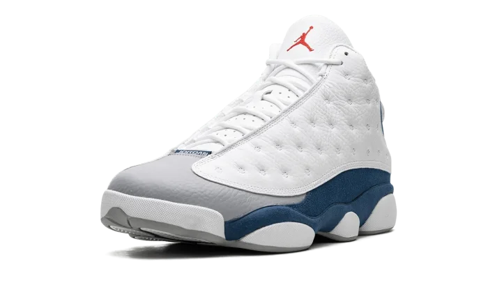 The Air Jordan 13 "French Blue" is a colorway of Michael Jordan's thirteenth signature shoe that unofficially nods to his playing days with the Washington Wizards. In no way associated with the Wizards, the "French Blue" nonetheless draws inspiration from Michael's former basketball team by employing the Wizards' team uniform colors on its design. The upper features a white dotted leather construction with contrasting French Blue-colored Durabuck on the mudguard and heel. Light grey leather appears on the toe. The holographic emblem on the collar that resembles a panther's eye is a salute to Michael's "Black Cat" nickname. The paw print-inspired outsole is another overture to both Michael's nickname and the stealthy feline. Release date: August 19, 2022