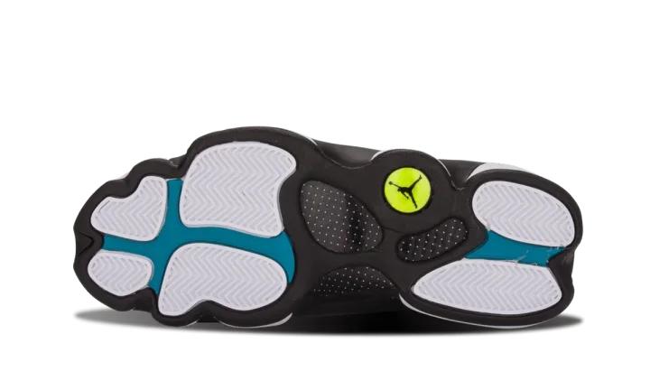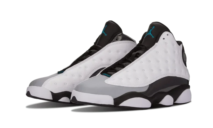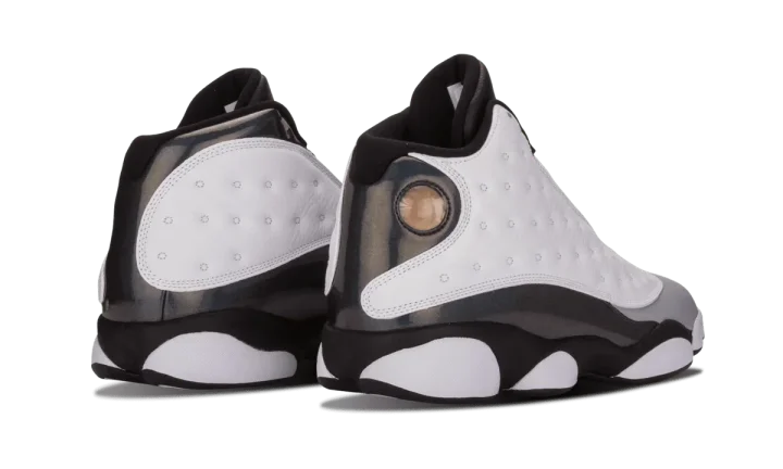 One of the most unique Air Jordan 13 colorways to date, this "Barons" version nicknamed for its similarity to the Barons Air Jordan 9 inspired by Michael Jordan's baseball stint features a white upper with black and grey accents. What makes it interesting is the glossy iridescent paneling wrapping the heel.