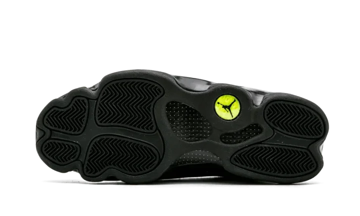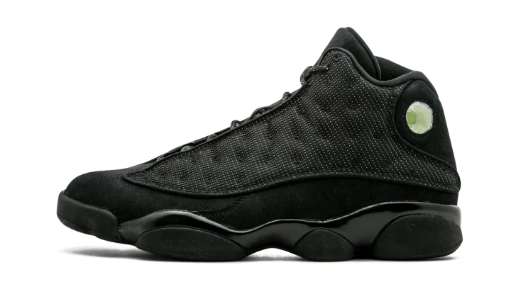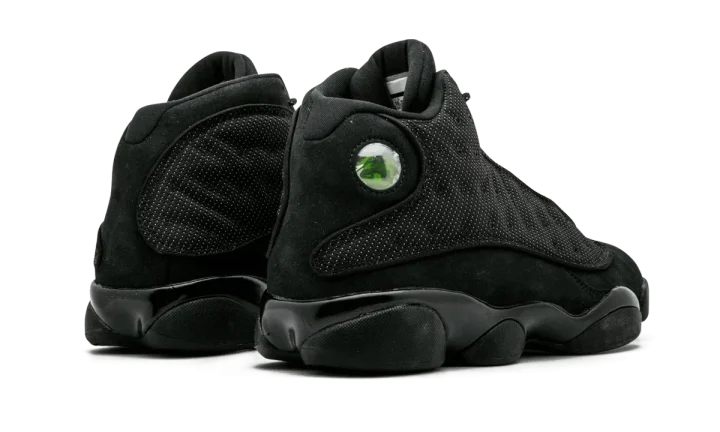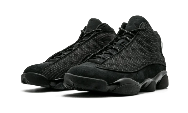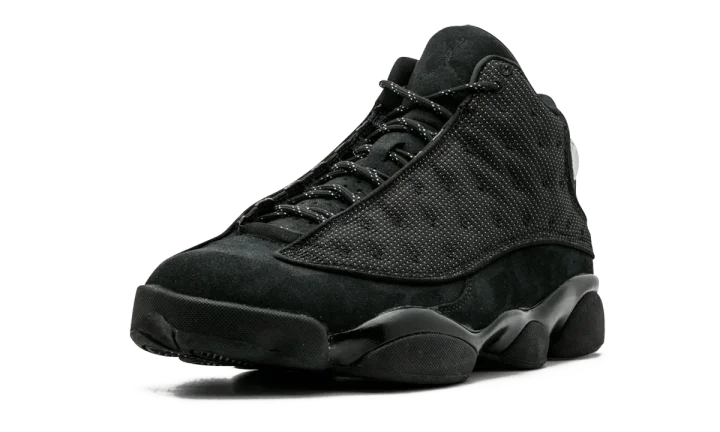 The Air Jordan 13 "Black Cat" is a stealthy edition of Michael Jordan's thirteenth signature shoe. Tinker Hatfield's design for the Air Jordan 13 was actually inspired by Jordan's "Black Cat" nickname, and modeled after certain aspects of a panther, including the paw-like outsole design and holographic "eye" Jumpman logo. The design inspiration comes full circle on this 2017 retro release of the Jordan 13 with an all-black colorway. The construction features a black suede base with reflective-accented black mesh paneling across the upper. Glossy black paint adds some textural contrast, while white stripes in the rope laces add the final touch. The Jordan 13 "Black Cat" released on January 21, 2017.