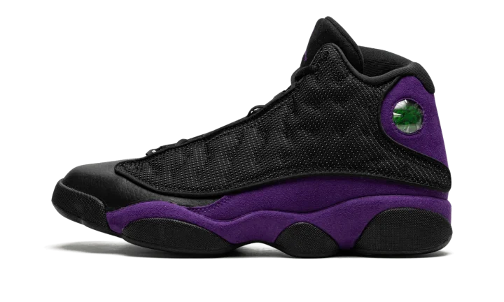 The Air Jordan 13 "Court Purple" is a January 2022 release of the retro basketball shoe in a colorway that shows love to the team uniform colors of the Los Angeles Lakers. The "Court Purple" edition of Michael Jordan's thirteenth signature shoe is yet another popular colorway that pays respects to the Lakers—the first being the aptly named "Lakers" makeup that was released in July 2019. Sans any official Lakers branding, the "Court Purple" nonetheless features the Lakers' color palette on its design. The "Court Purple" mimics the color block of the Jordan 13's original "Bred" colorway by substituting the red accenting for purple along the heel and mudguard. The black mesh upper is treated to a 3M reflective finish. A holographic emblem denoting Jordan's "Black Cat" nickname, meant to resemble a panther's eye, can be found on the heel. A Court Purple embroidered Jumpman is found on the tongue and white "Jordan" detailing appears on the vamp. Black midsole walls complete the look. Release date: January 8, 2022