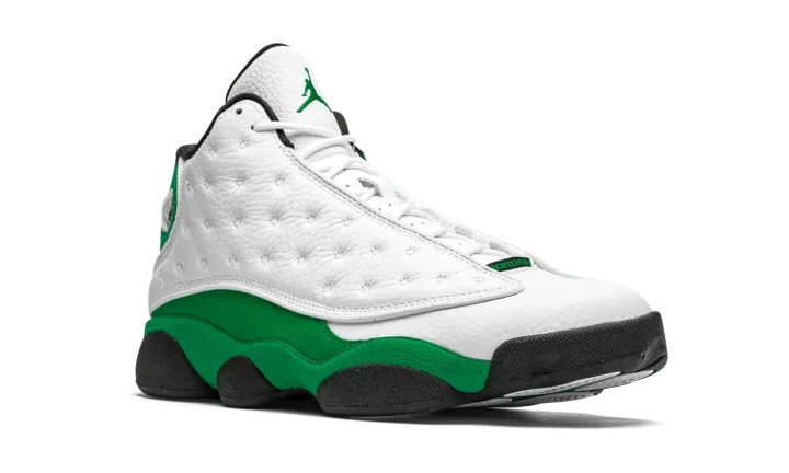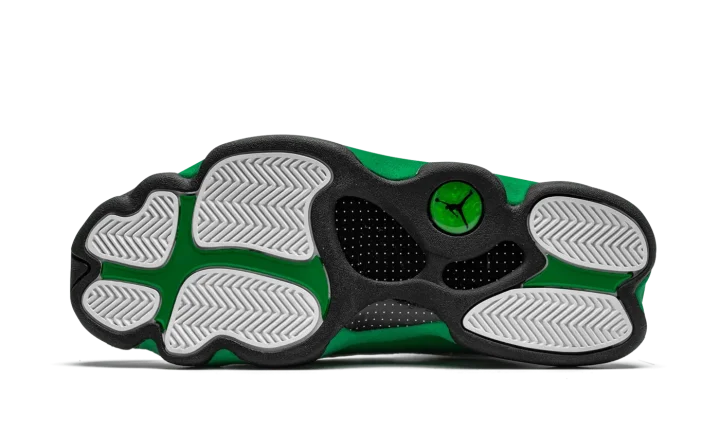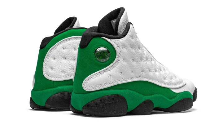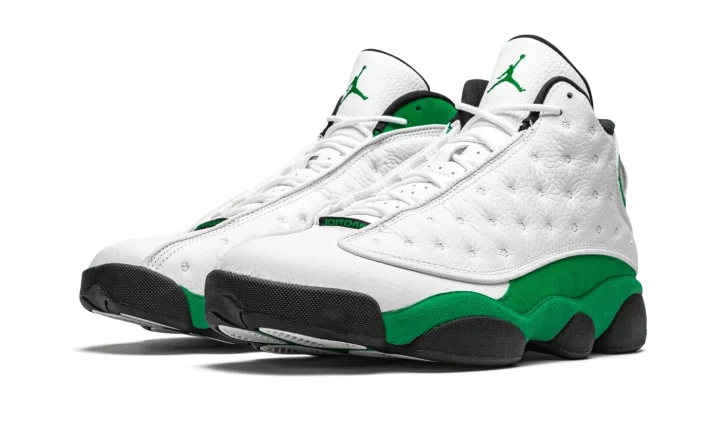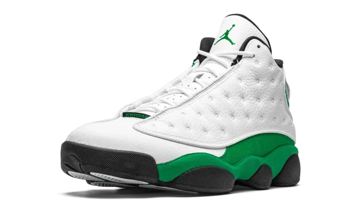 The Air Jordan 13 "Lucky Green" draws favorably from the team uniform colors of one of Michael Jordan's fiercest rivals during his playing career, the Boston Celtics. In the spirit of Ray Allen's Jordan 13 PE, this "Lucky Green" colorway displays the luck of the Irish throughout its design, beginning with a green nubuck on the mudguard, heel, and collar. The rest of the upper is outfitted in white leather with dotted embroidery. Branding hits include a black Jordan tag with green lettering on the throat, an embroidered green Jumpman on the white leather tongue, and a holographic emblem on the collar. A black liner and black midsole walls finish off the look. Release date: September 26, 2020.