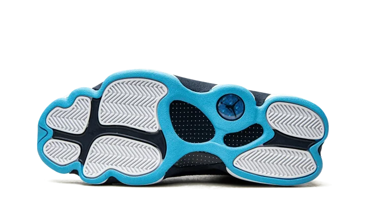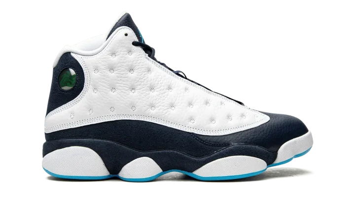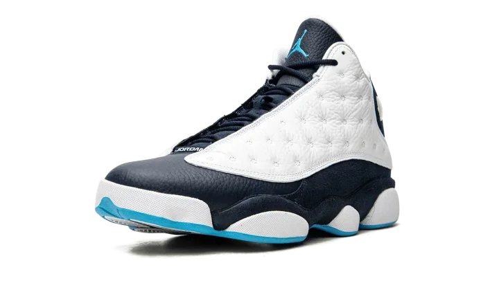 The Air Jordan 13 "Obsidian" is a September 2021 release of the vintage basketball shoe in a color block based on some of the model's original colorways. Looking to the Air Jordan 13's "He Got Game" and "Chicago" styles for inspiration, the "Obsidian" edition of Michael Jordan's thirteenth signature shoe is complete with a white tumbled leather upper and contrasting paneling, in this case, done up in Obsidian. The holographic emblem on the collar is a true-to-original design component of the Air Jordan 13. A Powder Blue Jumpman is embroidered on the Obsidian tumbled leather tongue and white "Jordan" text hits at the vamp. White midsole walls are contrasted by Powder Blue traction pods on the outsole. Release date: September 18, 2021