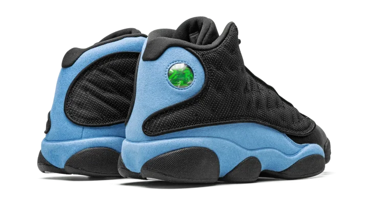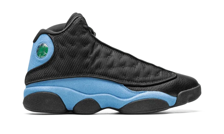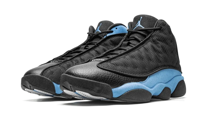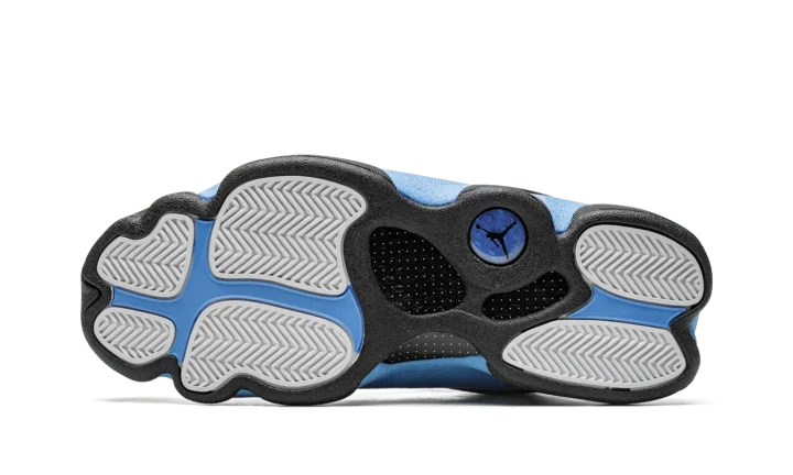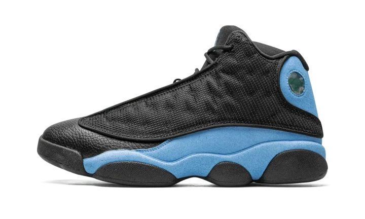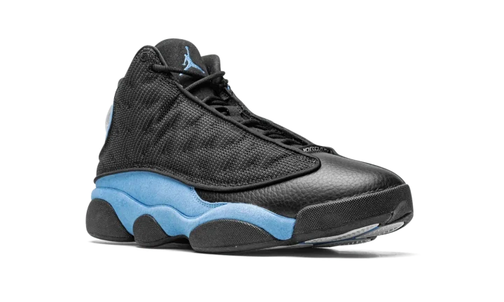 The Air Jordan 13 "University Blue" is a colorway of Michael Jordan's former signature shoe that pays homage to his alma mater, the University of North Carolina. While in no way affiliated with North Carolina or its basketball team, the Jordan 13's "University Blue" colorway nonetheless shows appreciation for the UNC Tar Heels by incorporating its signature light blue hue onto its design. The shoe features a dot-embroidered black mesh upper that's contrasted with University Blue suede overlays. The Jordan 13's signature holographic panther eye emblem appears on the lateral side of the shoe. A University Blue Jumpman is embroidered on the black leather tongue. Black midsole walls complete the look. Release date: December 23, 2022
