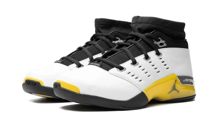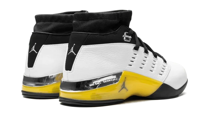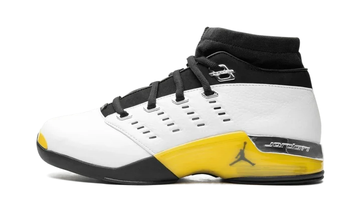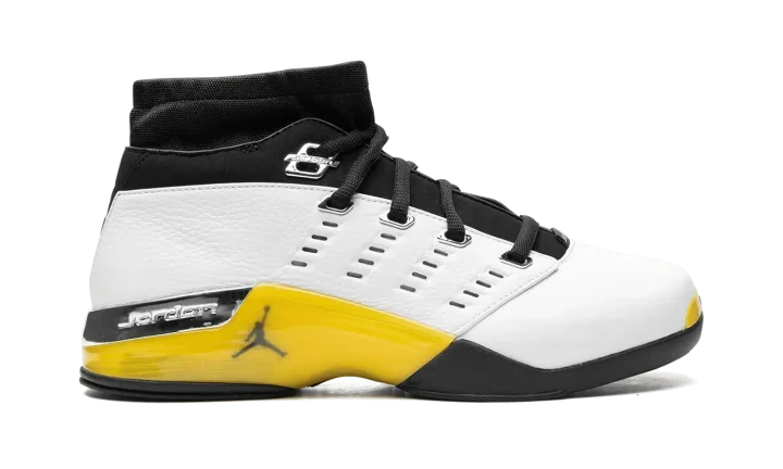 The Air Jordan 17 Low "Lightning" is the modern re-release of the colorway of the retro basketball shoe that was worn by Michael Jordan at the 2002 NBA All-Star Game. The Jordan 17 was Jordan's signature shoe with the Washington Wizards during the 2001-2002 NBA season, and the Jordan 17 Low "Lightning" was the sneaker "The GOAT" wore during his first appearance in an All-Star Game as a member of the Wizards. The modern version of the "Lightning" is a one-to-one remake of the original shoe that debuted in 2002. As for its design, the shoe has a white leather construction with Lightning Yellow accenting on the midsole and on the toe. A black "Jordan" tag appears on the vamp and a classic Jumpman is seen on the heel. Other details include a Black Dynamic Fit inner sleeve that provides a supportive yet comfortable fit, and a chrome overlay on the heel. Release date: February 10, 2024