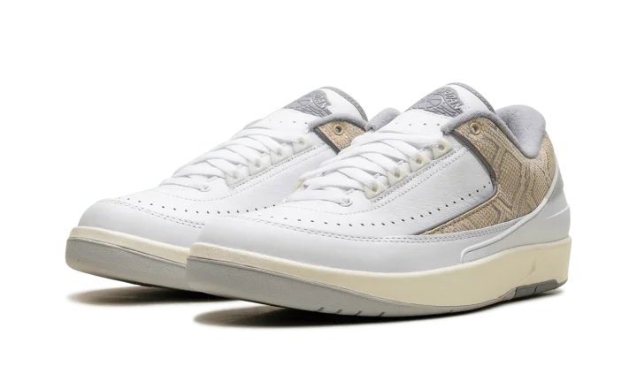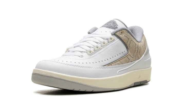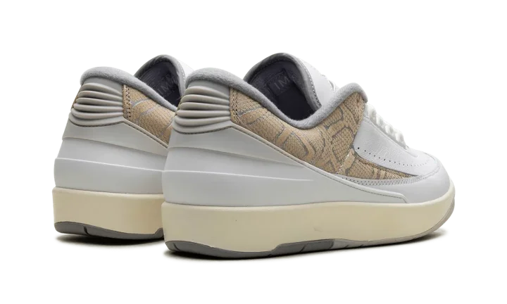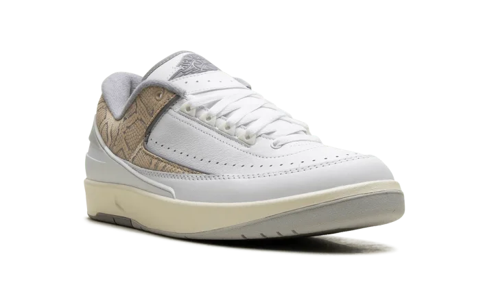 The Air Jordan 2 Low "Python" is the colorway of Michael Jordan's second signature shoe inspired by the Nike Air Python. Originally released in 1987 and said to be a combination of the Nike Air Force 2 and Jordan 2, the Air Python is known for its faux lizard skin material on its design, which is the material that inspires the reptilian detailing on the Jordan 2 Low "Python." The upper has a white leather construction and with a brown-based snakeskin pattern on the mid-panel overlay. An old school grey "Wings" logo is seen on the tongue. Underfoot, a Sail midsole sits on top a Cement Grey rubber outsole, completing the look. Release date: February 7, 2024