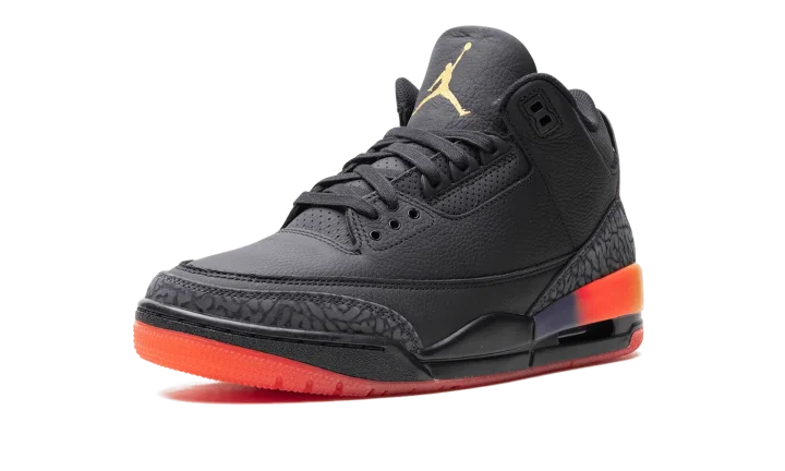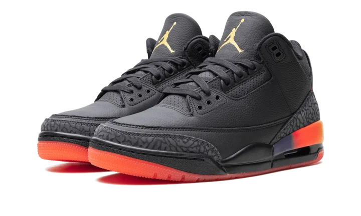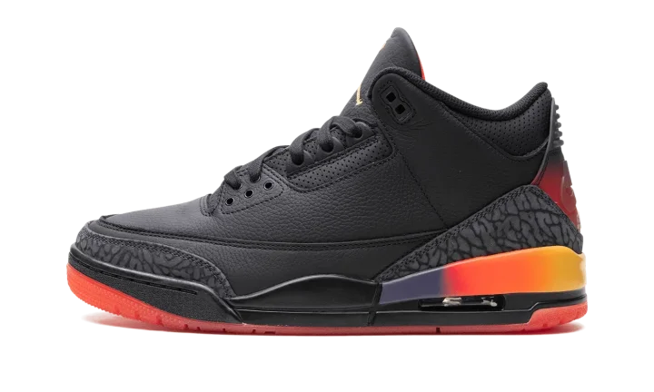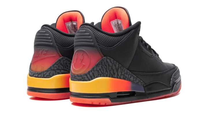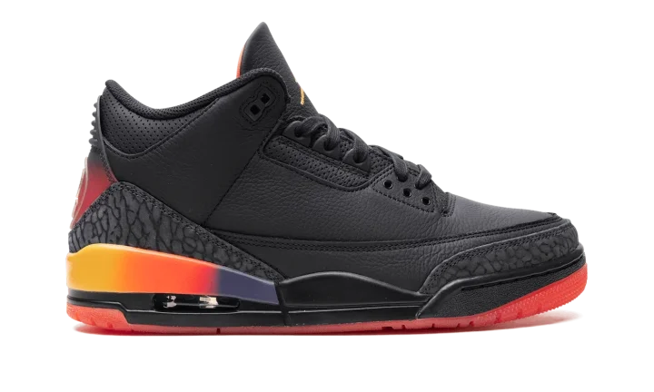 The J Balvin x Air Jordan 3 "Rio" is a collaboration by the popular recording artist on a colorway of the classic Jordan sneaker inspired by his son, Rio. J Balvin and Jordan Brand have worked together on colorways of the Air Jordan 1, Air Jordan 2, and Air Jordan 3 in consecutive years since 2020. The "Rio" represents the fourth project between the two entities, and second on the Jordan 3 following 2023's "Medellín Sunset"." As for the design, the shoe features a black leather base with classic grey elephant print on the toe and heel inspired by the pattern found on the original Jordan 3 from 1988. A gradient midsole with a Solar Flare and Total Crimson Abyss color combination matches the appearance of the heel counter with "Nike Air" on the left shoe and J Balvin's signature smiley face logo on the right shoe. Unique design elements inspired by J Balvin's son Rio are seen throughout the shoe. Release date: Summer 2024