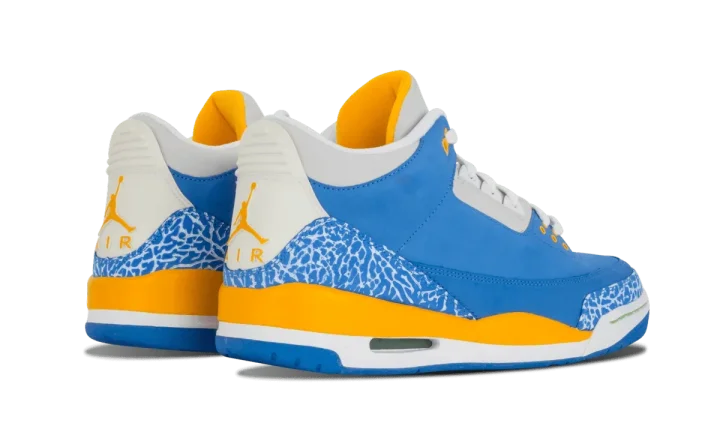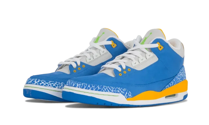This bold rendition of the Air Jordan 3 from 2007 features a colorway inspired by Spike Lee's landmark film Do the Right Thing, with a bright blue upper and yellow and green accents derived from the look of the movie's promotional poster.