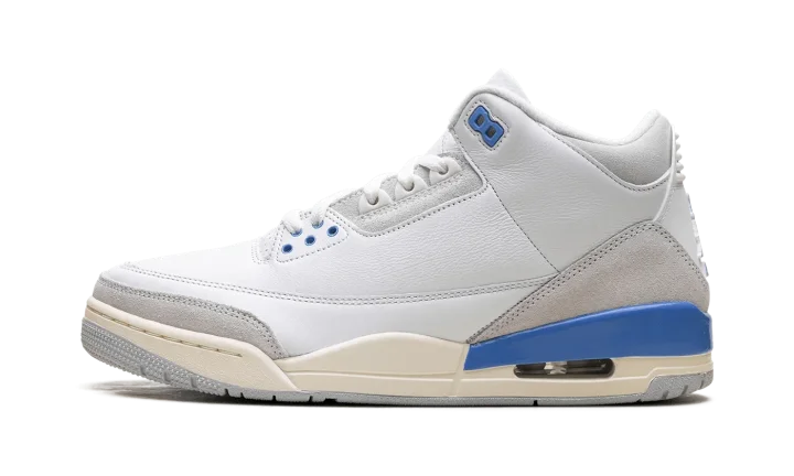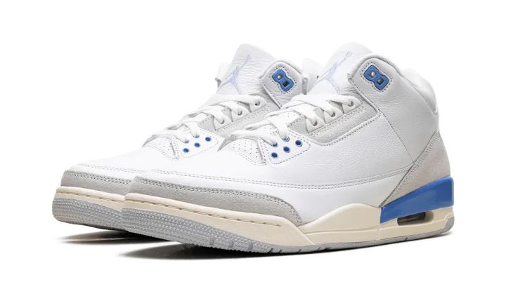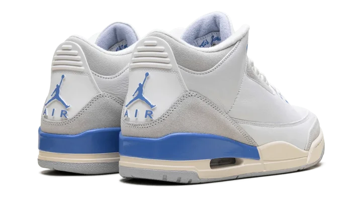 The Air Jordan 3 "Lucky Shorts" is a blue and white colorway of Michael Jordan's third signature shoe. The "Lucky Shorts" AJ3 takes inspiration from a pair of UNC shorts that Jordan wore underneath his NBA uniform during his carer. The upper on this Jordan 3 mixes white leather with off-white suede and adds Carolina blue accents throughout.